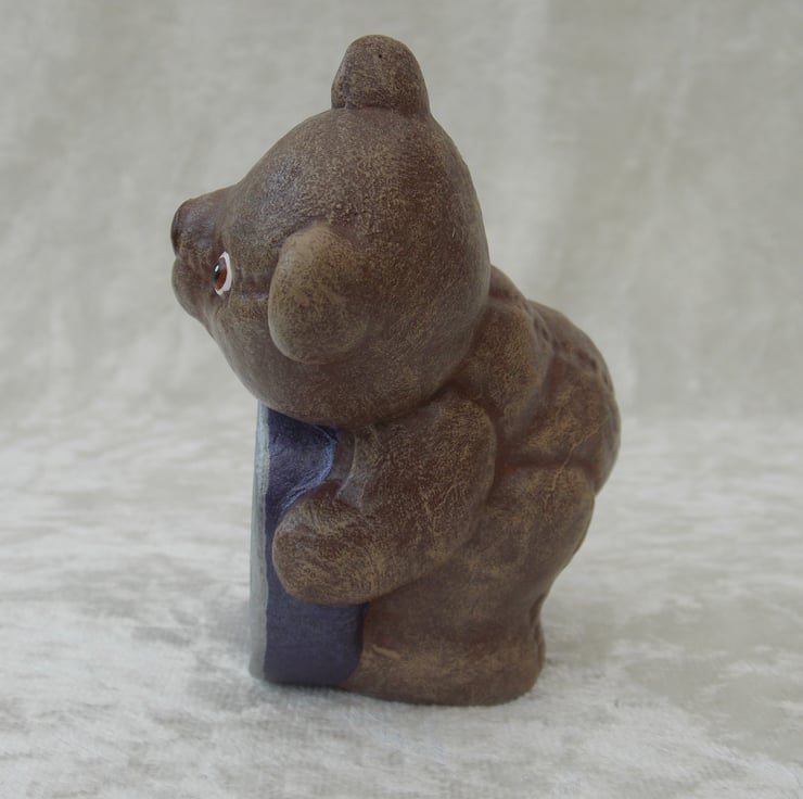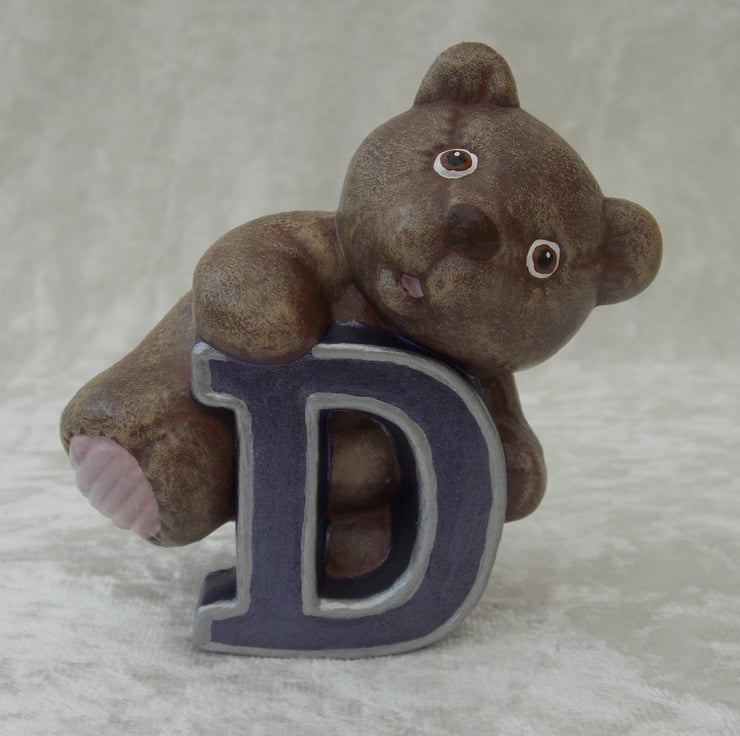 I have for sale a small ceramic animal ornament, which was hand painted by myself. It is a standing brown bear figurine, leaning and holding onto an alphabet capital letter D. This would make a fun and novel addition to any child's bedroom shelf, or perhaps given as a gift.