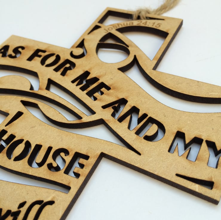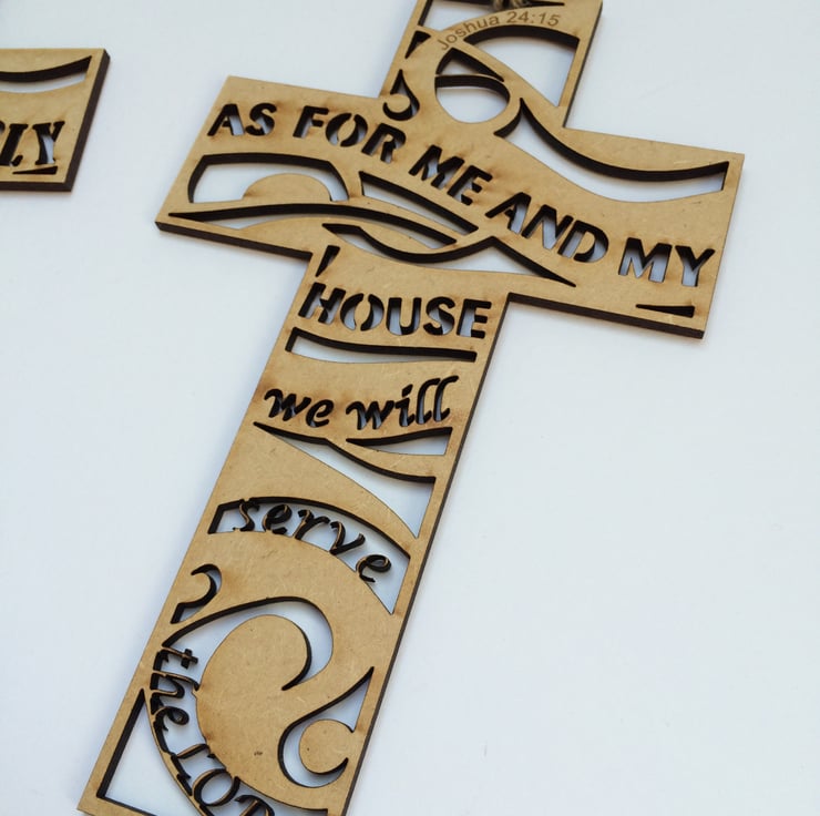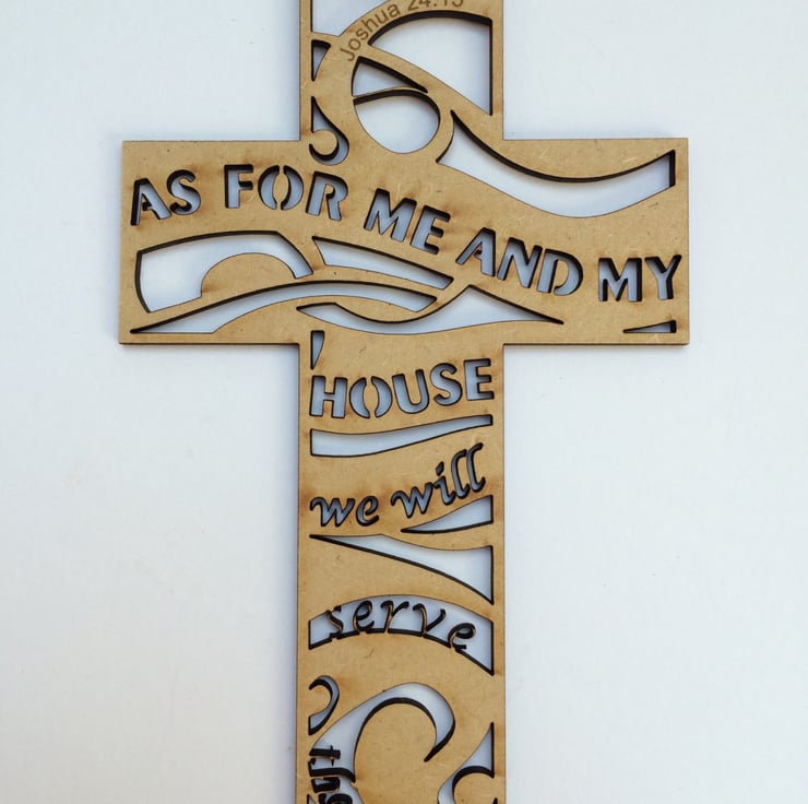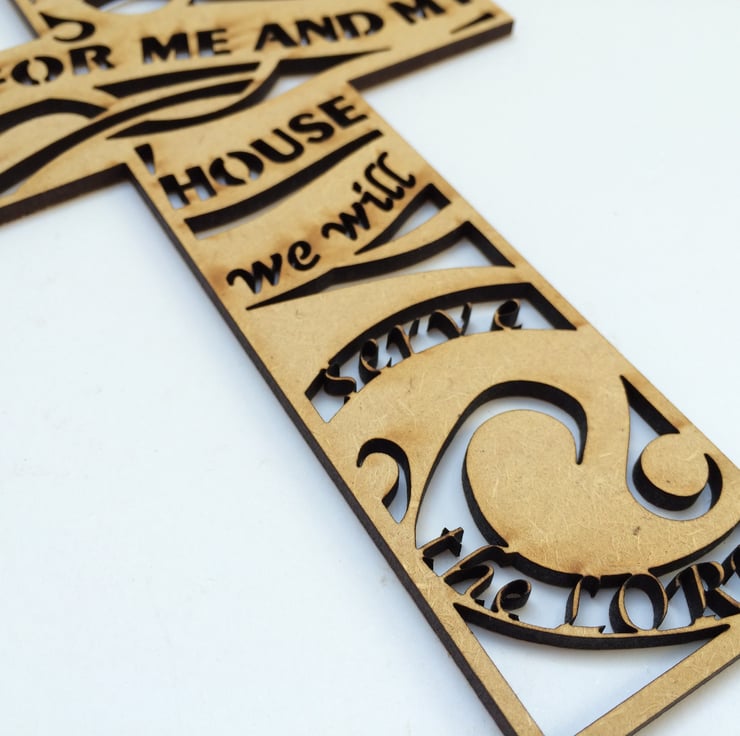 A delicate wooden cross lasercut with the text of Joshua 24:15