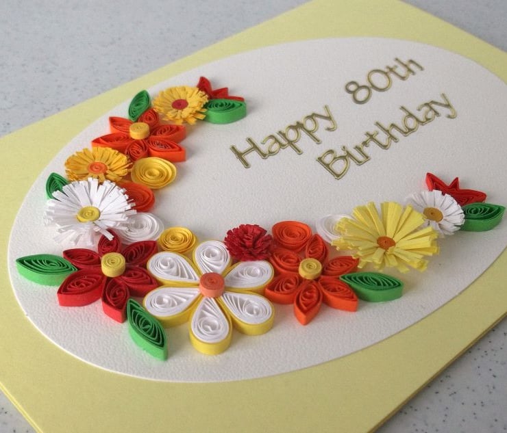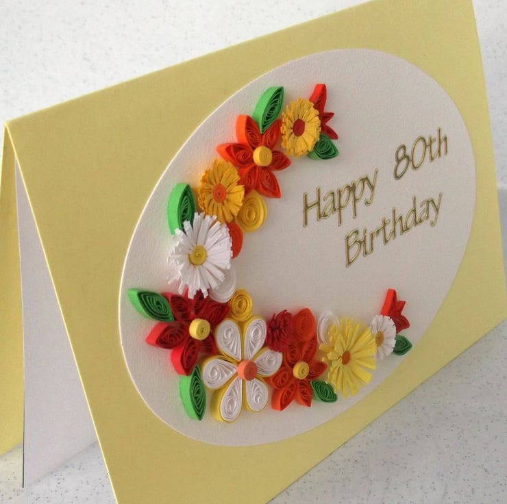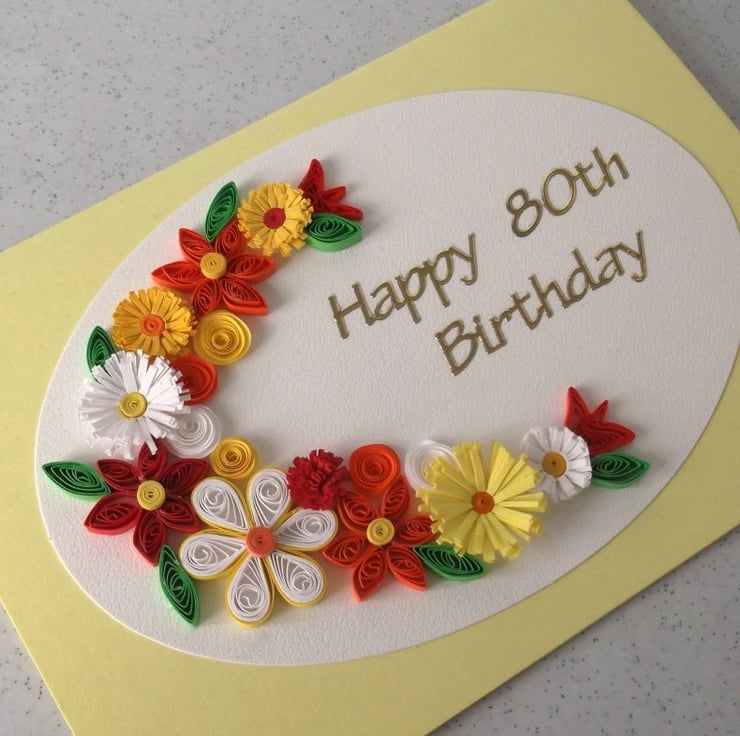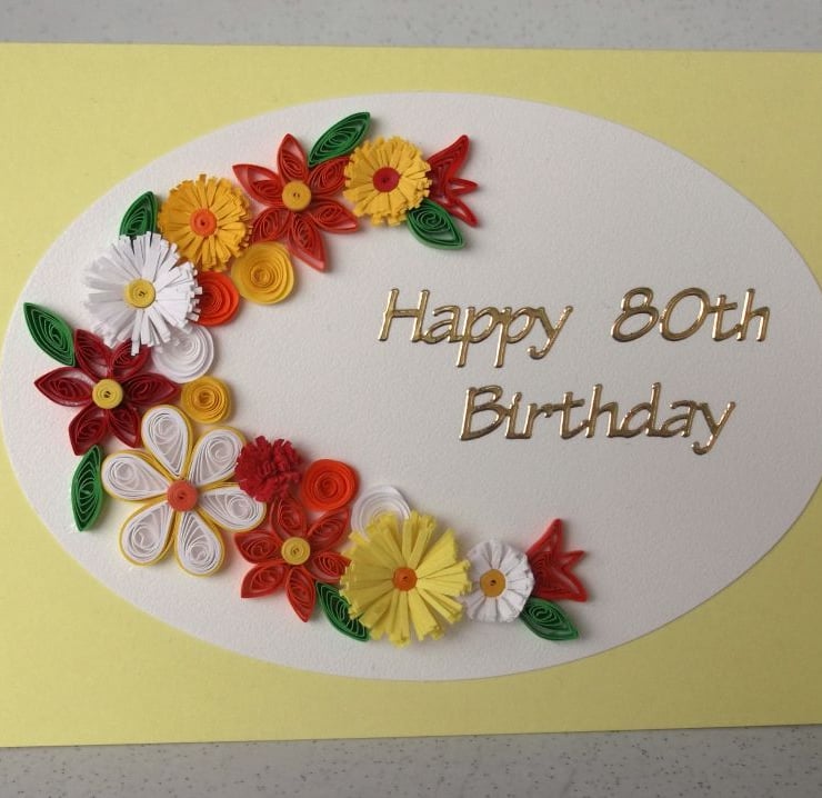 All the quilling on this card is handmade by me! Each petal, bloom and leaf is handrolled from strips of coloured paper. An arrangement of quilled daisies and foliage surrounds an oval scalloped panel, which reads Happy 60th Birthday or can be personalised with any message you need. The result is a beautiful original card which makes a great keepsake for the future.
