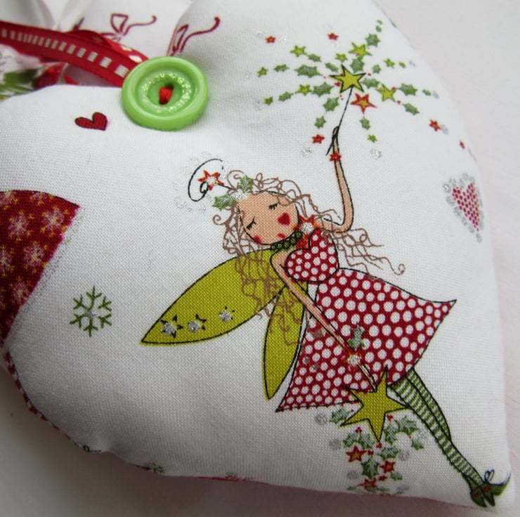 This pure cotton fabric has a little bit of sparkle with some silver glitter adorning the fairies dresses and wands. The hearts are backed in red cotton fabric and a hand sewn patch - making the back of the heart as lovely as the front. Generously stuffed with toy filling, and finished off with a hanging ribbon and a couple of buttons.