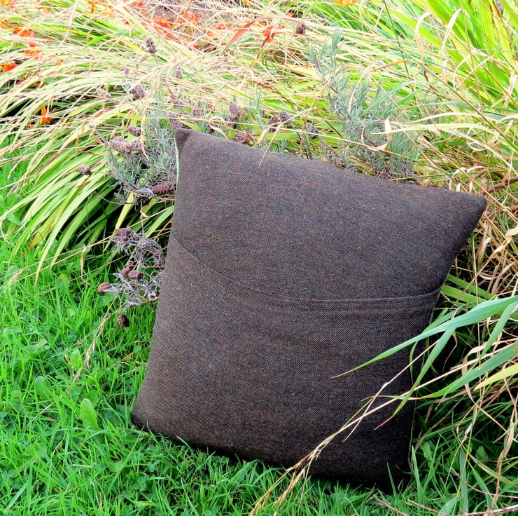 The cushion is backed with a contrasting wool mix fabric in a dark olive brown.