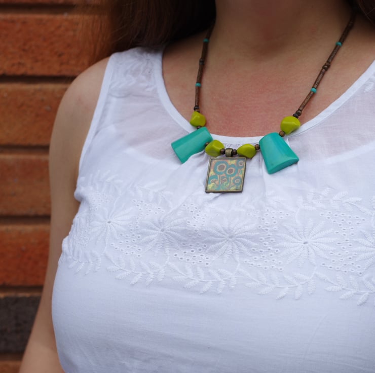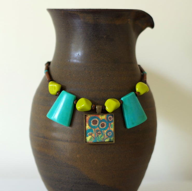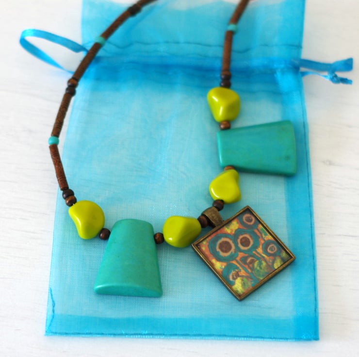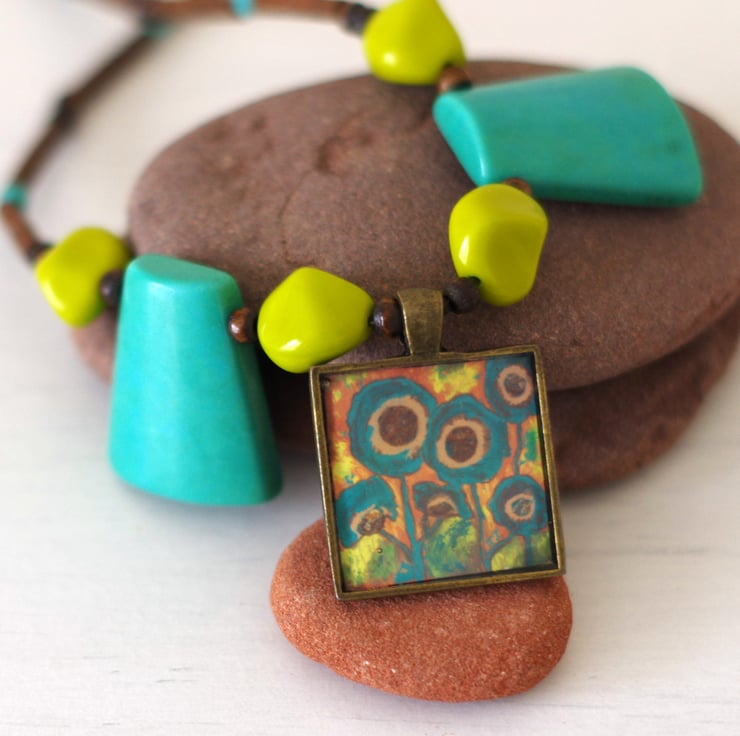 Dare to be different with this tribal style necklace created around an art resin pendant necklace and two turquoise tribal style gemstones. I created the pendant using a mini art print after my original painting titled 'Blue Poppies' fixed onto the bronze tray with clear ice resin. For the necklace I used turquoise gemstones, tube wooden beads, turquoise glass beads and brown obsidian. The necklace is 19" long including clasp and the pendant is 1" square.