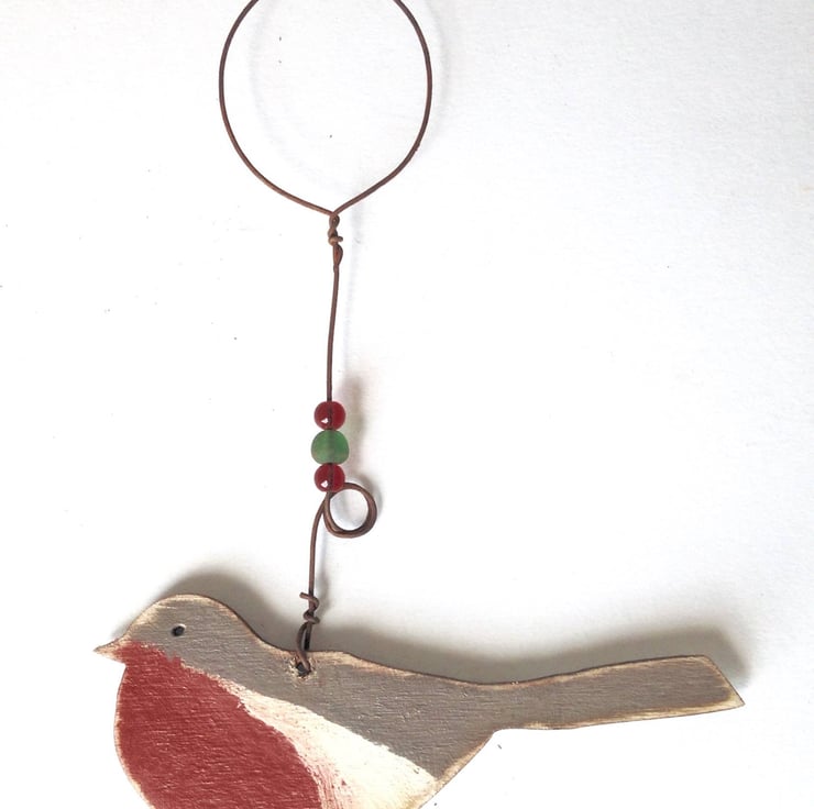 Laser cut Robin using our designs in fsc plywood. Hand painted on both sides by myself and a little rusty wire and beads attach to hang this colourful little robin up. A great addition to the festive home.