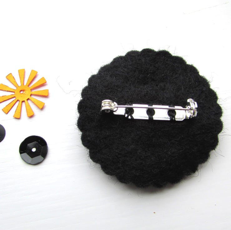 The pumpkin has been hand-drawn on shrink plastic and coloured then fixed to a white shrink plastic circle which has been decorated. This is then attached to a black coloured scalloped felt circle. A brooch fastening is stitched onto the back of the felt. Brooch measures approximately 4cm in diameter.