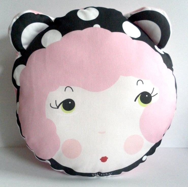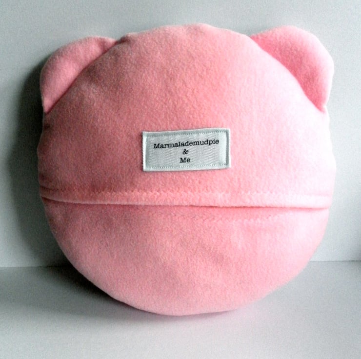 A handmade vintage inspired story character cushion digitally printed with a soft tactile fleece reverse. Great for little girls rooms so soft and huggable. Snuggly little bear ears to hold on to.