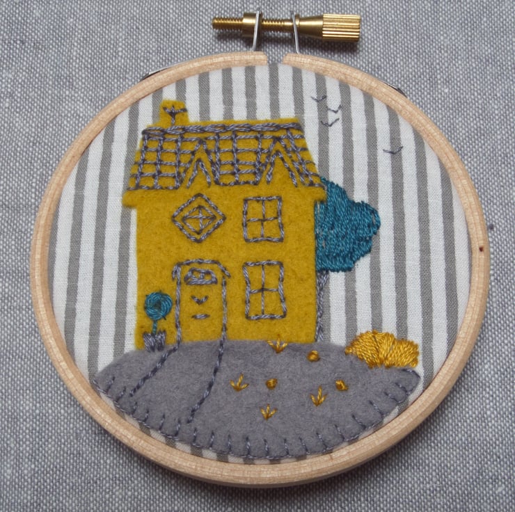 Each hoop is 3" wide, and made from printed cotton, appliquéd with wool felt and hand embroidered. I designed and made each house embroidery in my attic studio at home in Nottingham. The back of the hoop is covered with a card backing.