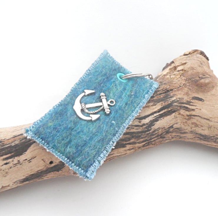 A key fob for all your sea faring folk. Shades of blue merino wool have been used to make the felt used for this key fob and a tibetan silver anchor charm has been added. A silver coloured 25mm split ring key ring is included. The key fob measures approximately 7cm x 4cm and would make a lovely little gift for any sea loving folk.