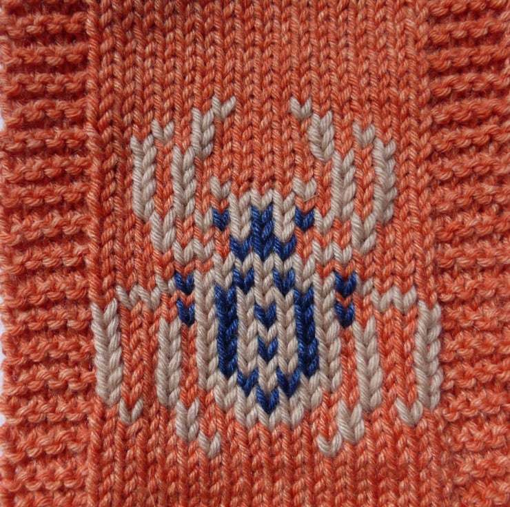 This ‘spooky spider’ headband is worked in stocking stitch with garter stitch bands either side. The spider is added to the stocking stitch section using Swiss darning (duplicate stitch) once the headband has been knit, however the spider (or spiders!) could be added whilst knitting by using the intarsia method. The headband is knit flat on two needles with a seam at the back.