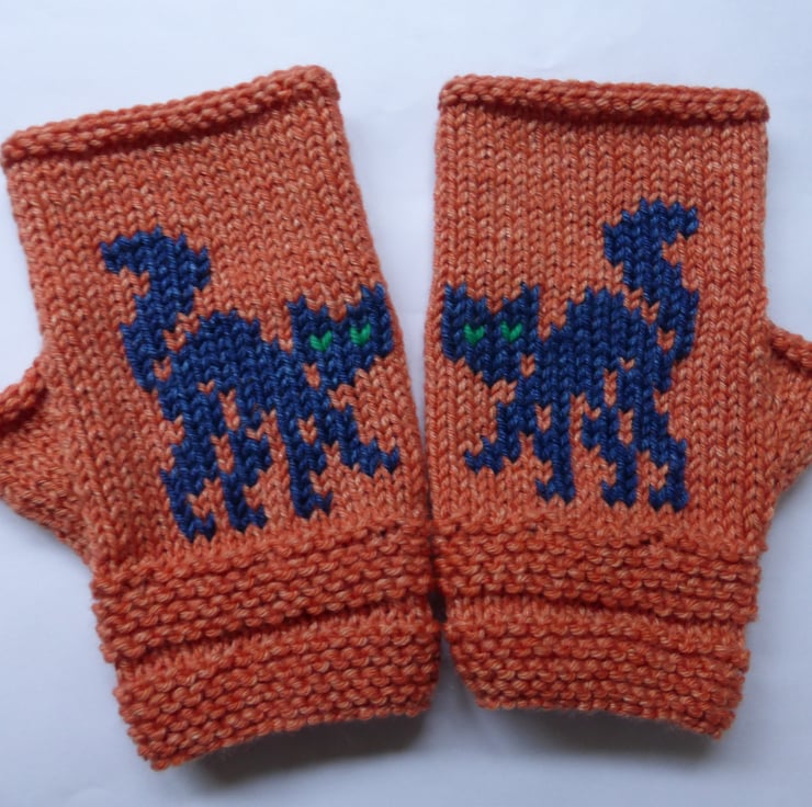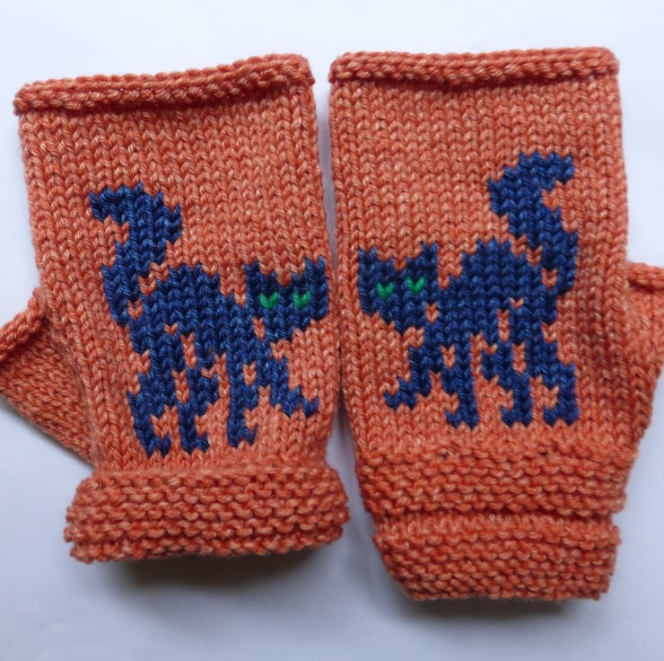 These ‘Black Cat’ fingerless mitts are worked in stocking stitch with garter stitch cuffs. The cats are added using Swiss darning (duplicate stitch) once the knitting is complete; however they could be added whilst knitting by using the intarsia method. The mitts are knit flat on two needles with a side seam.