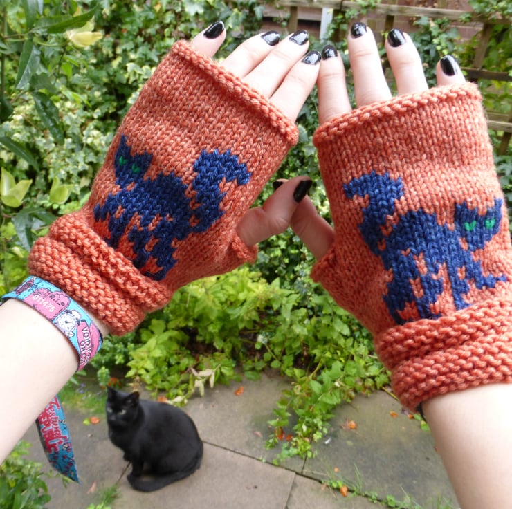 This is a detailed written KNITTING PDF PATTERN for Halloween themed fingerless mitts suitable for children, teens and adults, the pattern includes row by row instructions, a chart and photos to help you along the way!