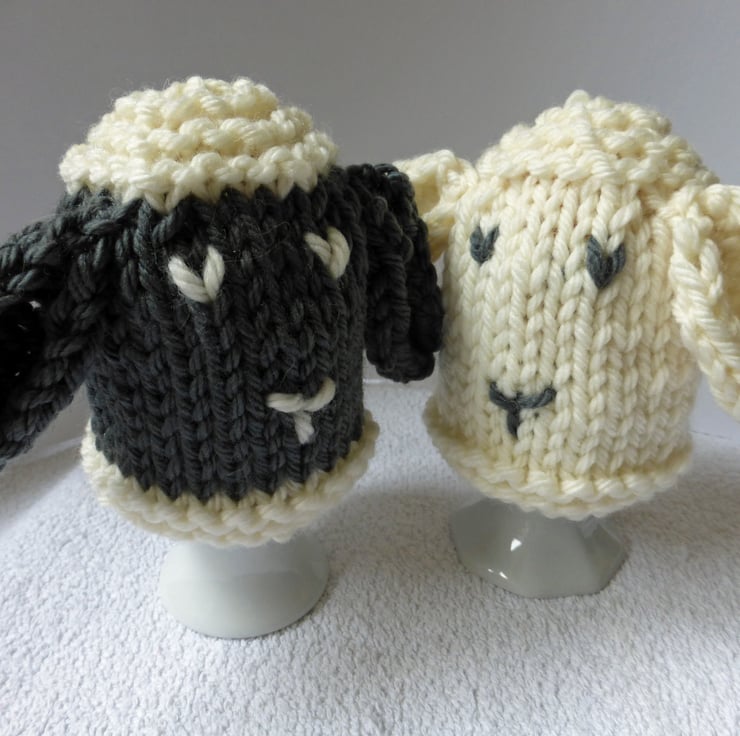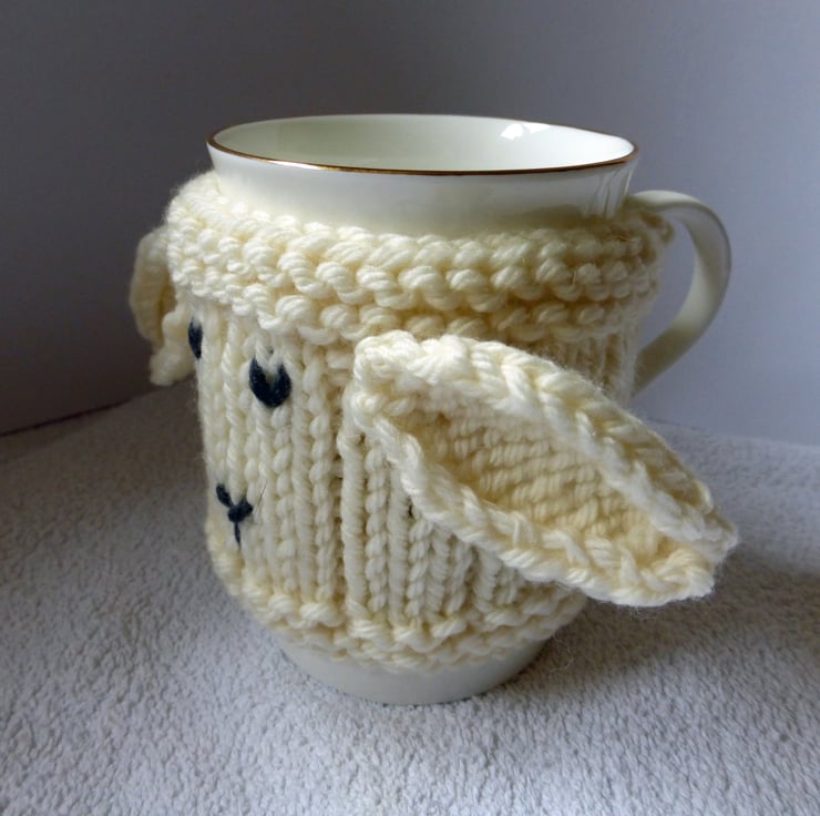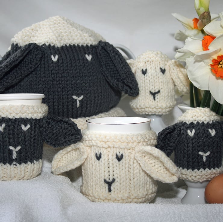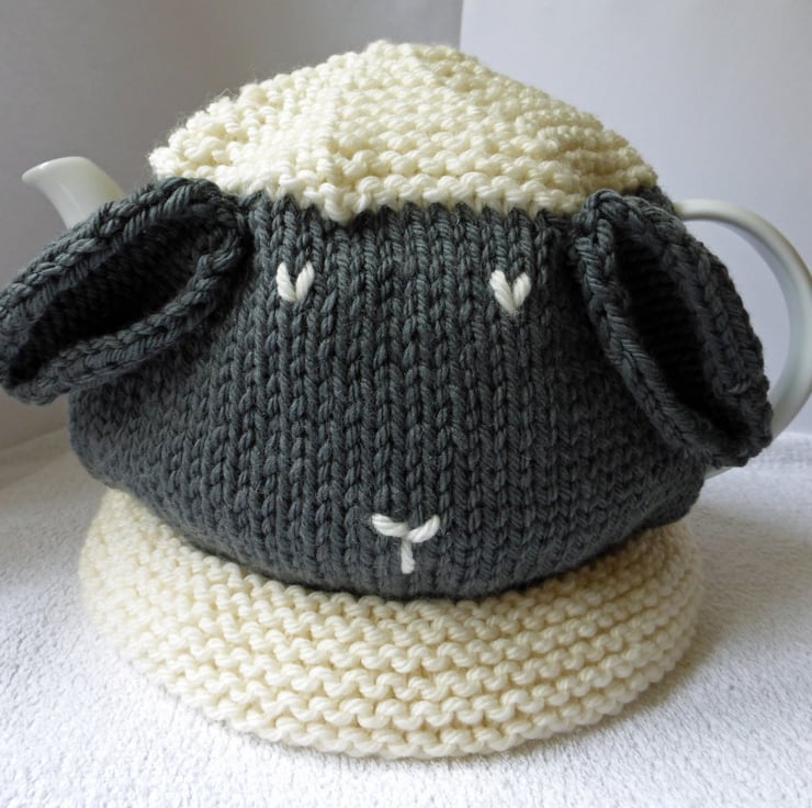 I recommend using a wool or wool mix Aran weight yarn to keep your teapots, cups and eggs warm. The sheep cosies are worked mainly using stocking stitch and garter stitch, they have embroidered eyes and nose, the ears are knit separately and sewn on upon completion. The cosies are knit flat on two 5mm/US 8 needles and seamed where necessary.