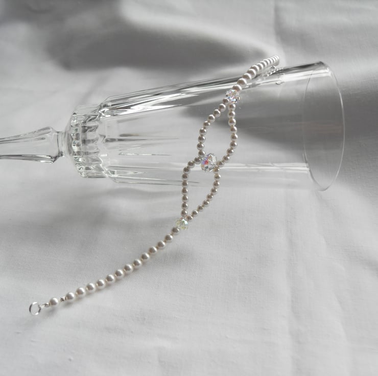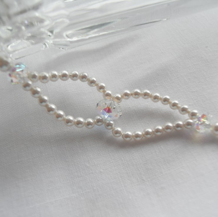 Made to order. Two loops of 3mm white high end crystal pearls are joined together with a high end crystal "diamond" briolettes before joining 4mm white high end crystal pearls to make this elegant bracelet. Fastened with a sterling silver bolt clasp.