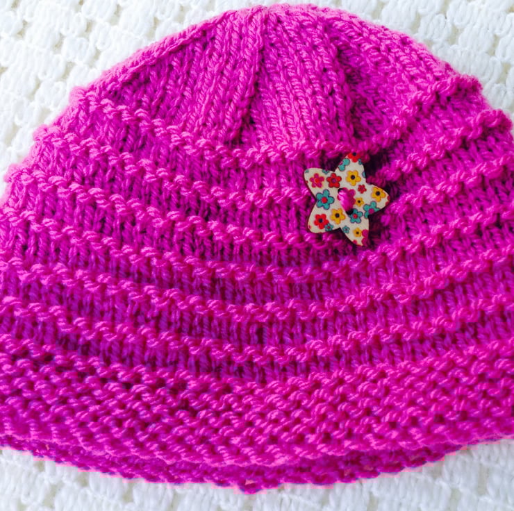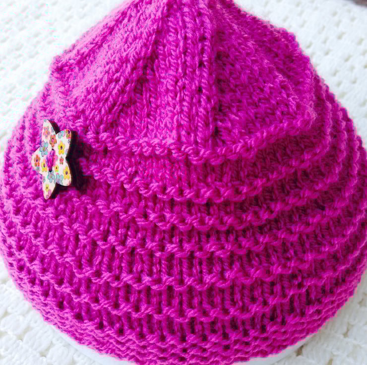 This is a beautiful hand knitted baby hat, perfect for those chilly mornings