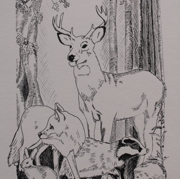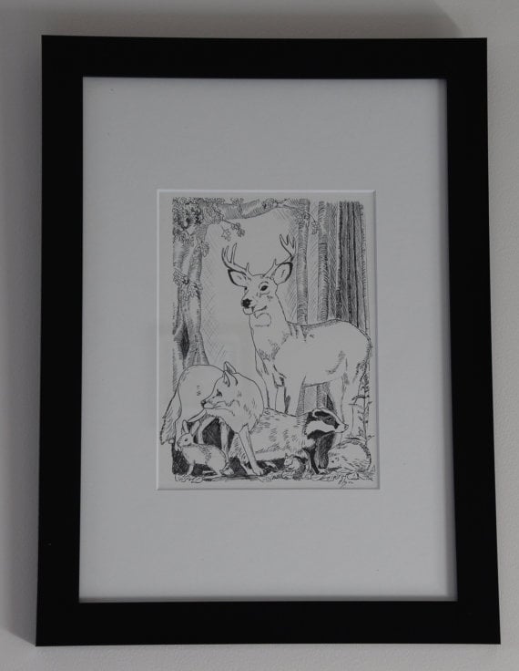 This is a giclee print from an ink drawing of some woodland animals. The image contains a deer, fox, badger, rabbit, hedgehog and a mouse.
