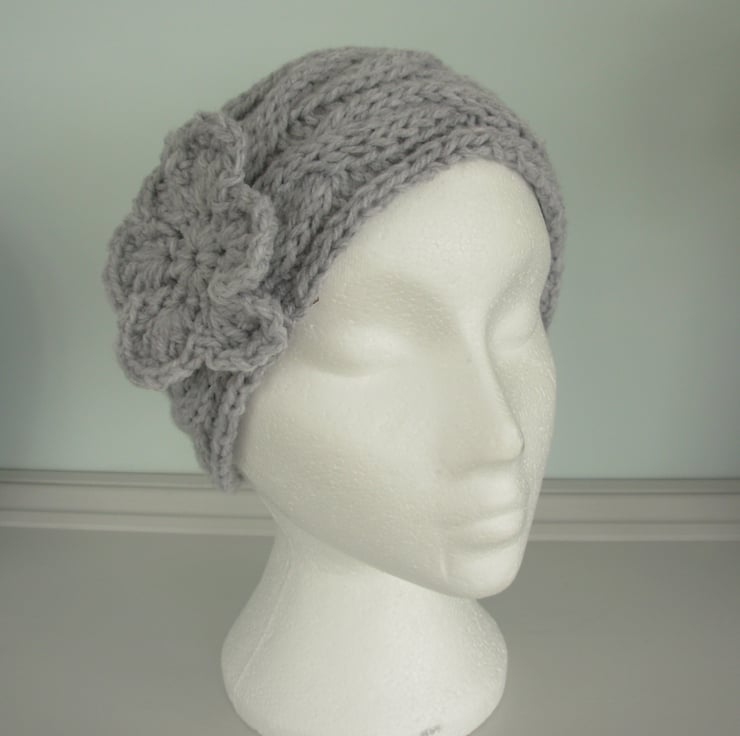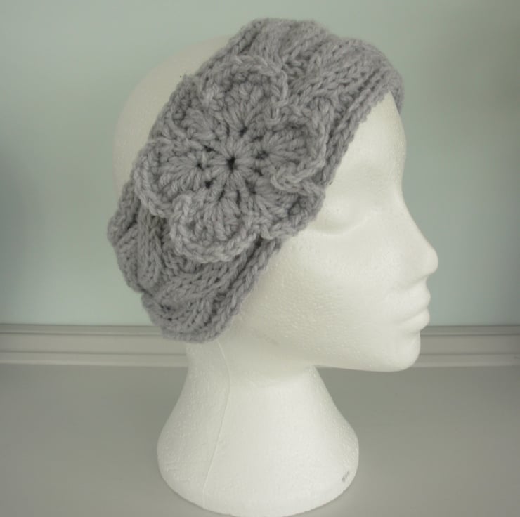 I've knitted this adults ski band, ear warmers, head band, in a light grey chunky acrylic yarn. Cable stitch body and finished with a single layer crochet flower.