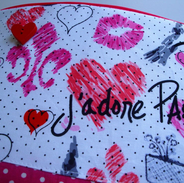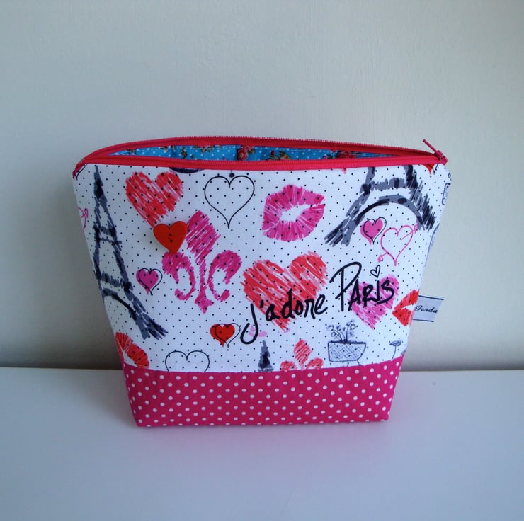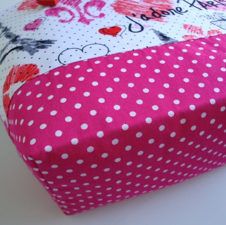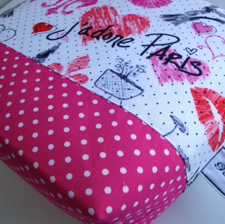 Handmade in a lovely printed cotton fabric ( interfaced ) with a Paris theme . Lower half has been made in a raspberry pink polkadot cotton fabric .