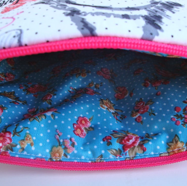 A lovely handmade printed cotton Wash bag , ideal for storing a selection of your toiletries - also great as a travel/overnight wash bag .