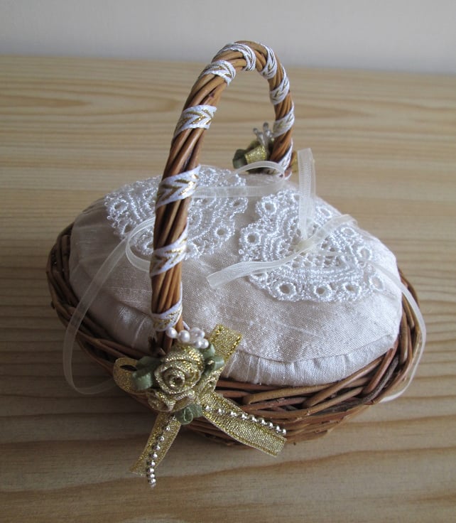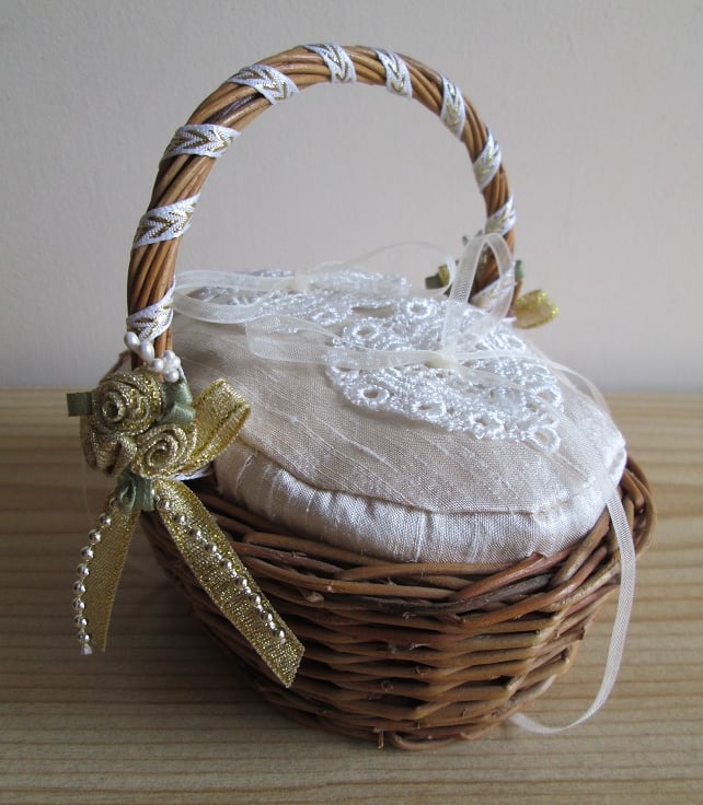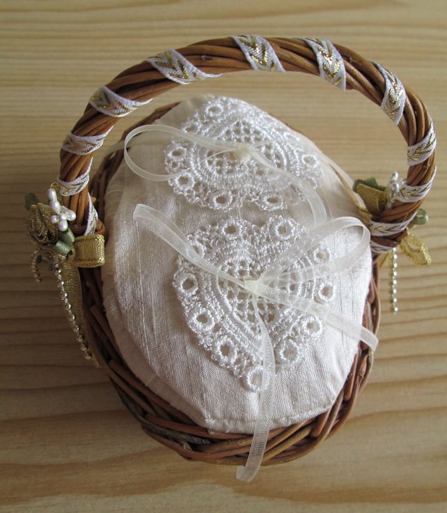 Perfect for a small ring bearer - a tiny, oval, wicker basket, with an antique cream silk cushion, embellished with ivory guipure lace hearts and organza ring ribbons. The handle is wound with cream and gold ribbon and finished with tiny bunches of gold ribbon roses.