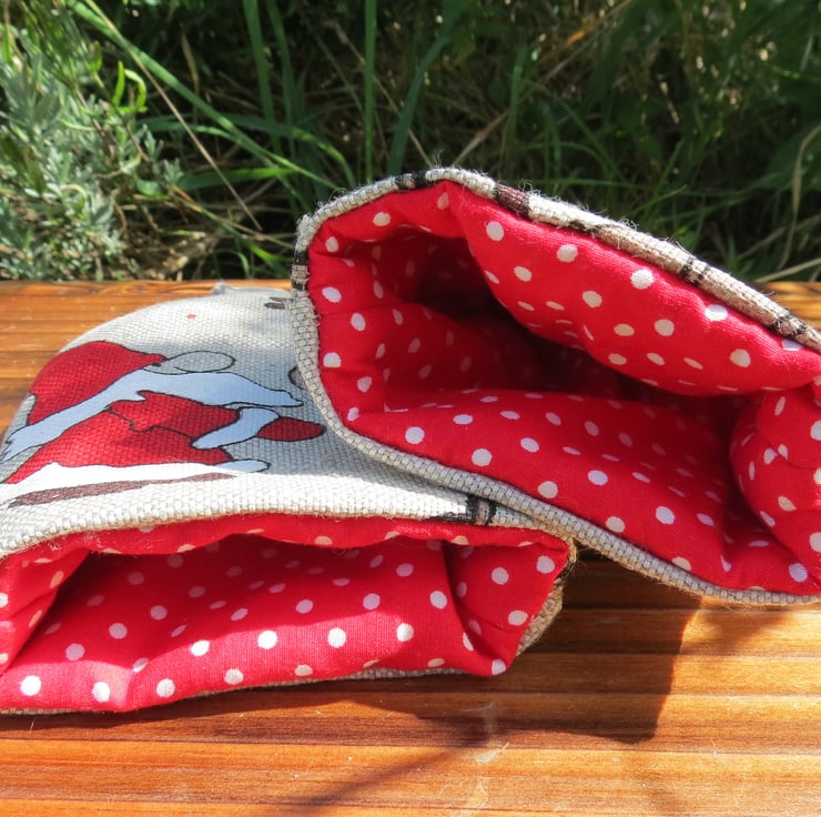 The lining fabric is a red and white polka dot cotton, with an additional layer of wadding to keep your egg warm.