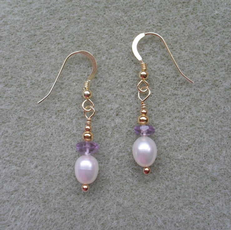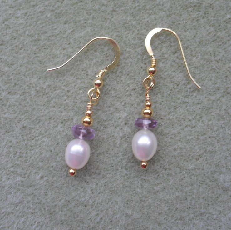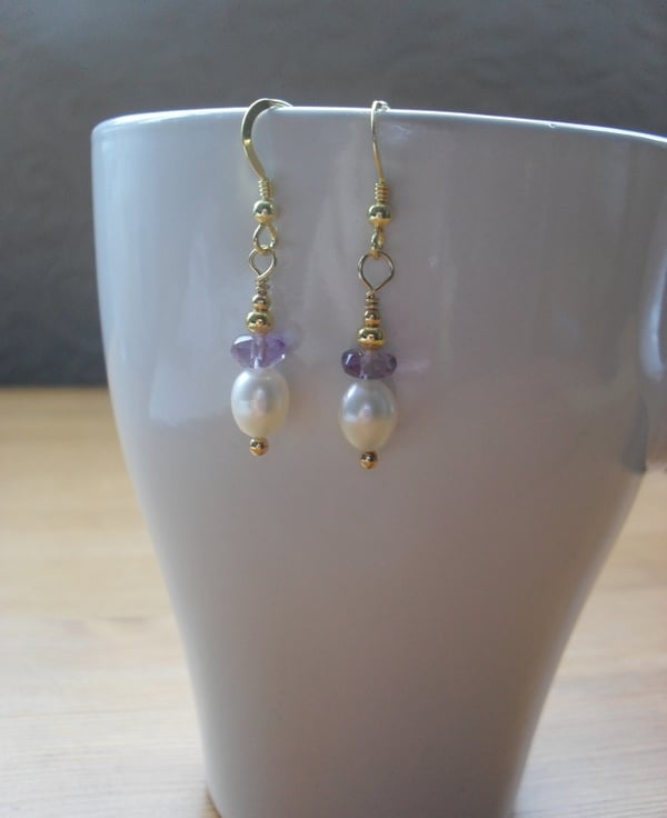 White fresh water pearls and amethyst are attached to gold vermeil ear wires