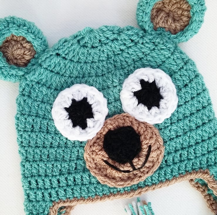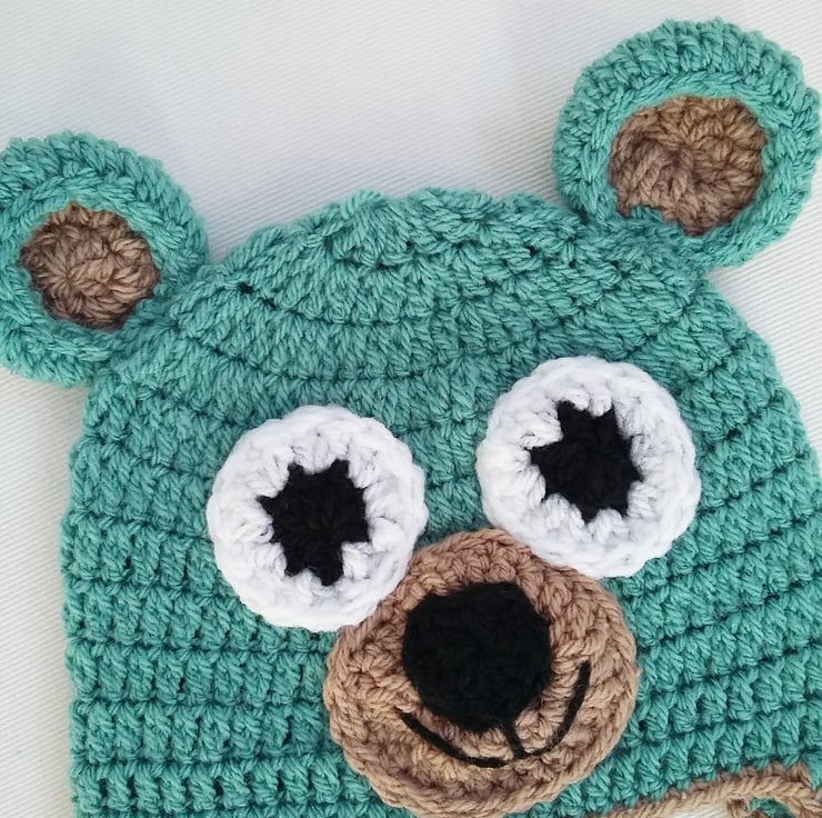 Made in sage green and light brown earflap style hat with tassels , featuring an adorable bear face and 3D ears! The earflap style is not only adorable, but will help keep your little one extra snug and cosy!