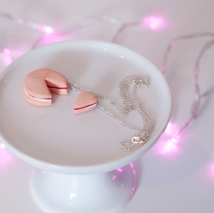 A cute Victoria sandwich cake with a teeny slice cut out showing the am and cream layers, threaded onto a necklace
