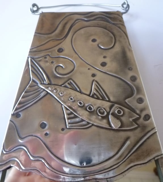 This beautiful legendary sea creature is made from hand tooled pewter, she is pictured surrounded by beautiful happy fish and swirling lines and bubbles suggesting the ebb and flow of the sea around her.