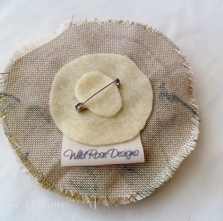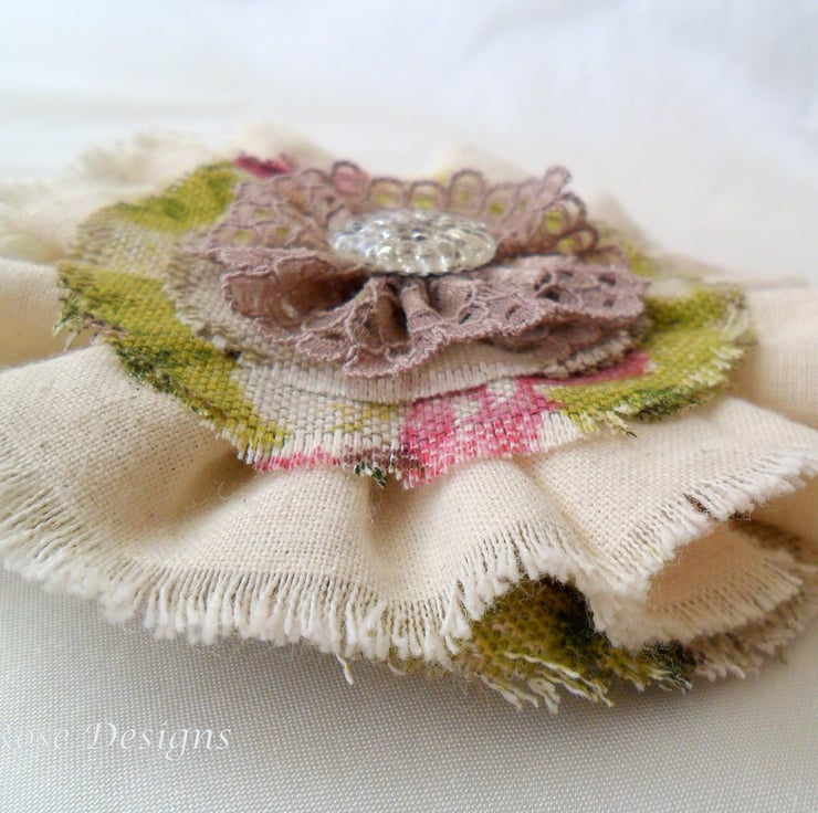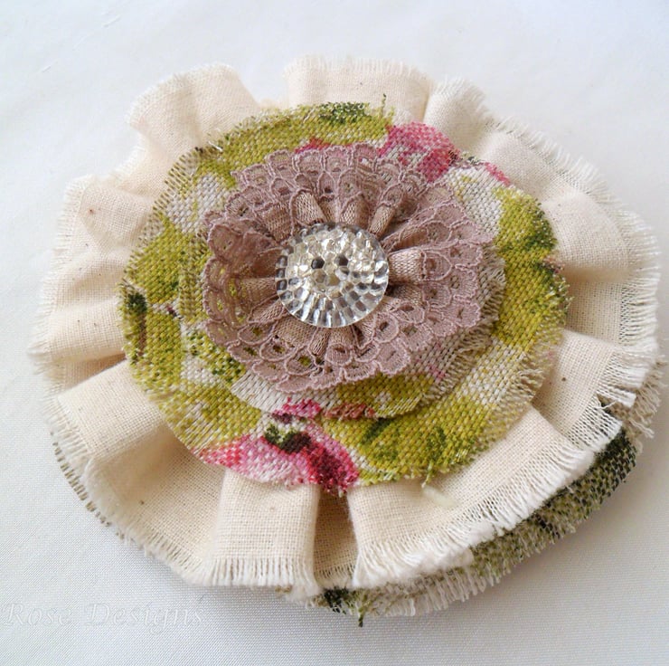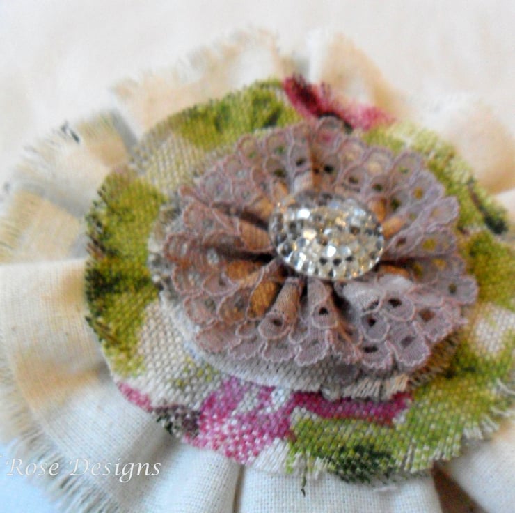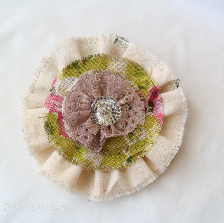 This pretty, feminine brooch or corsage is handmade using a cotton fabric in a floral print. It has been gently frayed at the edges for texture and layered with ecru cotton and coffee coloured lace. A clear dimpled acrylic button is positioned at the centre and there is a brooch pin on the reverse. The brooch measures approximately 4" (10 cm) in diameter.