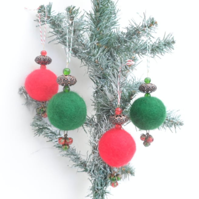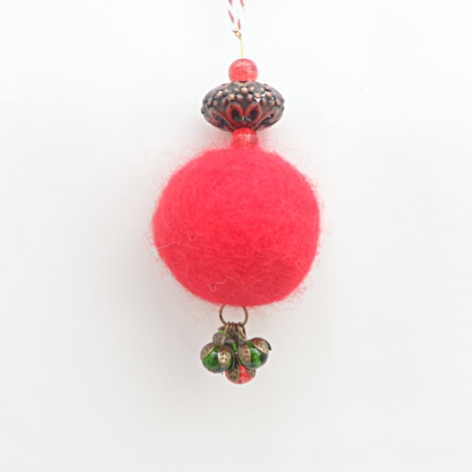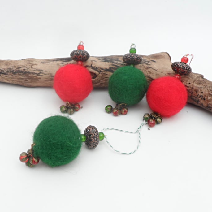 Made in traditional christmas colours of red and green, these hanging christmas decorations feature a large (approx. 4cm, 1.5") felted ball combined with a large antique copper coloured filigree bead an a couple of glass crackle beads. Dangling from the base of the decoration is a cluster of "berries" consisting of glass crackle beads wrapped in antique bronze coloured bead caps. The length of the decorations is approximately 10cm (4") excluding hanging thread. The hanging thread is made from a co-ordinating bakers twine.