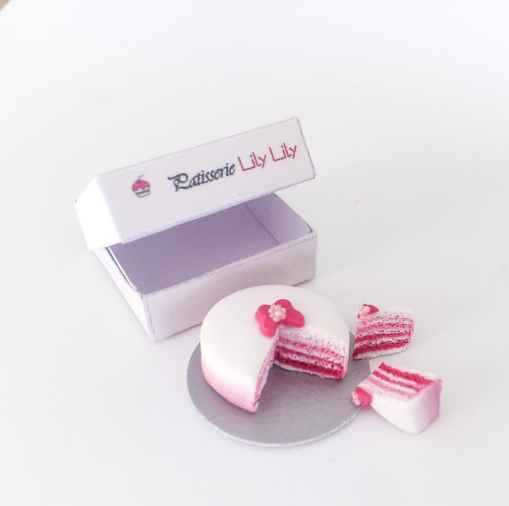 The cake and two slices are supplied in the tiny handmade Patisserie Lily Lily cake box which measures 2.6cm square. The cakes are not fixed in place (unless specifically requested by you).