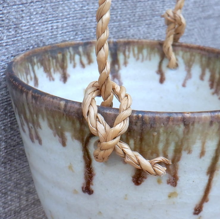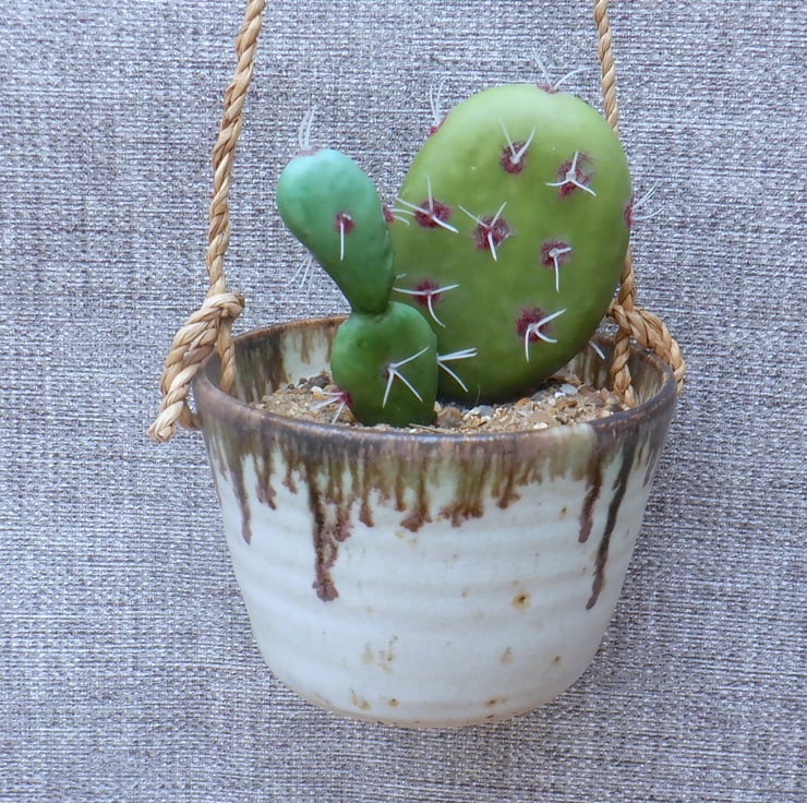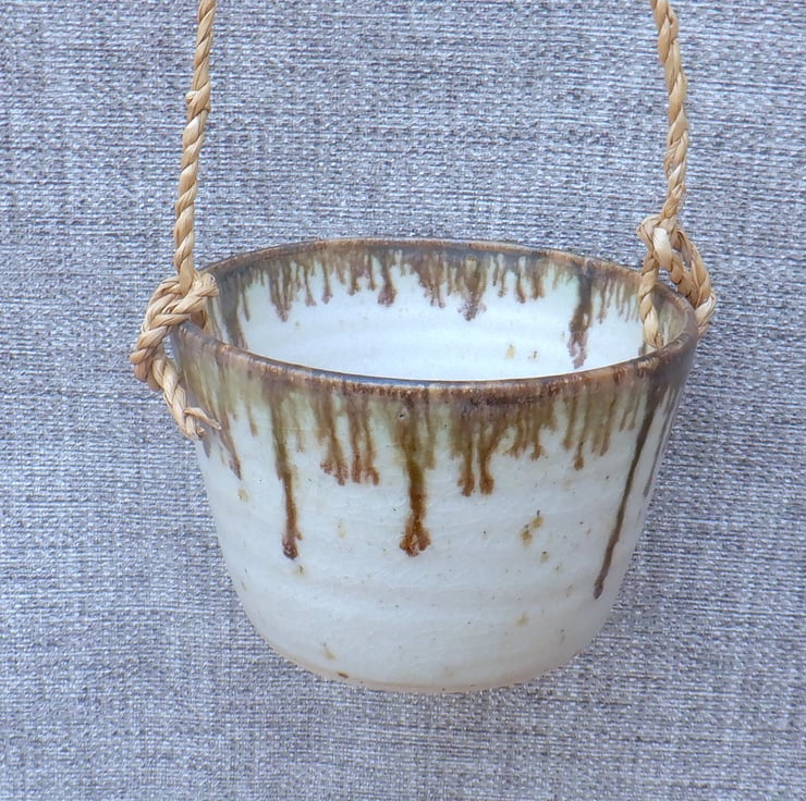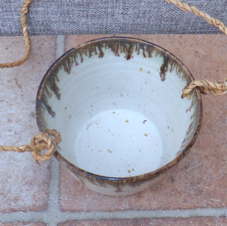 I threw this useful small planter on my pottery wheel using strong ivory stoneware clay, with a distinct speckle, and finished it in a lovely satin ivory cream glaze with some bronze drizzled over the rim..