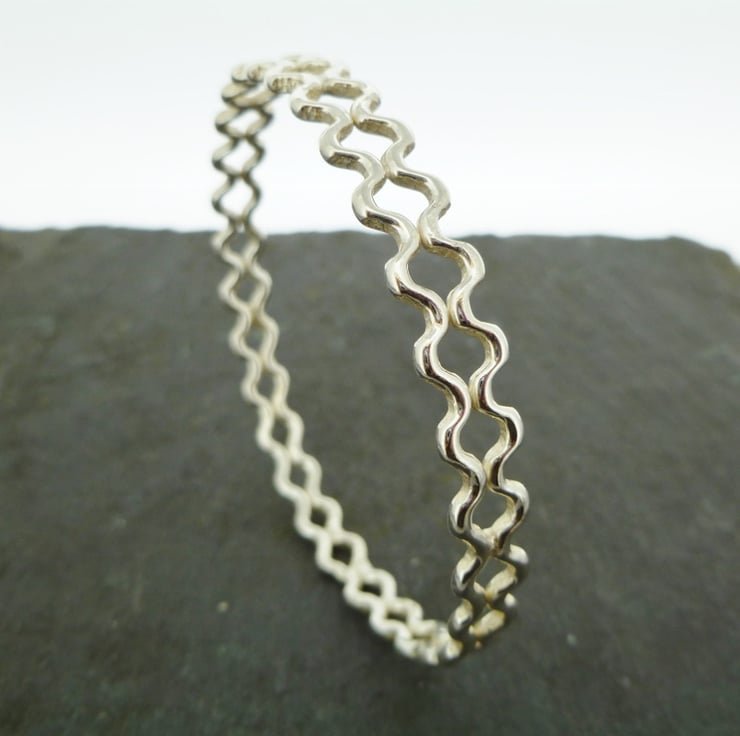 I hand-crafted this beautiful bangle from two lengths of 2mm sterling silver round wire. After shaping the two lengths they are soldered together to form the bangle. The finished piece is approximately 9mm wide.