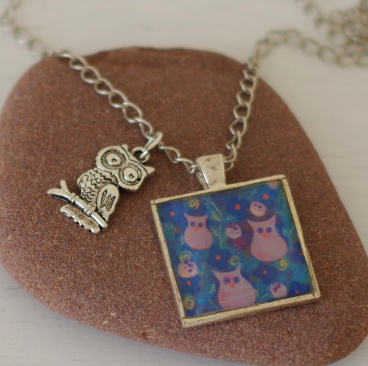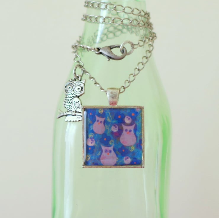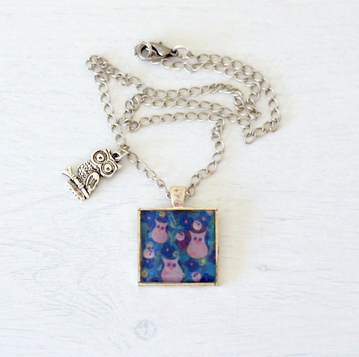 This is a pendant necklace created with an art print after one of my paintings fixed onto the silver tray with clear ice resin. The chain is Italian silver. The necklace has an owl charm which complements the image of the pendant. The image is printed at home on 270 GSM satin artist paper. The pendant is 1" square and the necklace is 18" long. The pendant necklace comes in an organza bag. This is the perfect gift for animals/owls lovers.