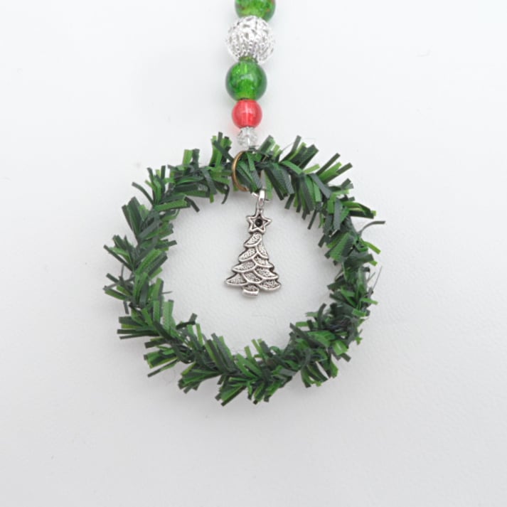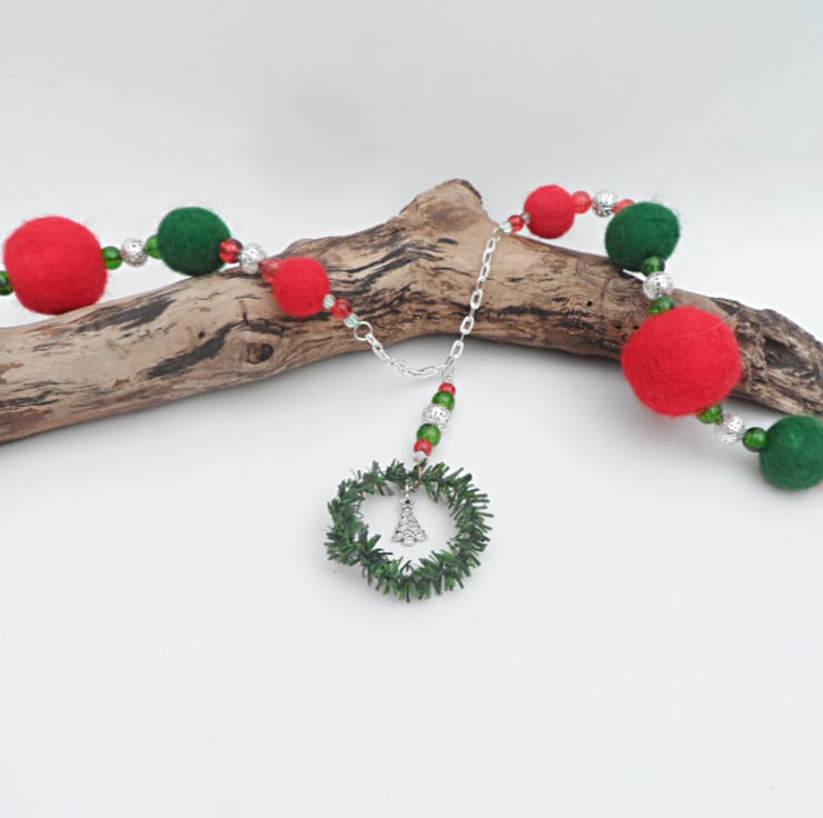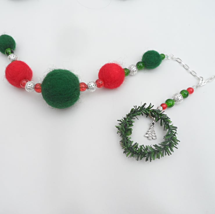 This christmas garland has been made in traditional christmas colours of red, green and silver. The basic garland consists of sections made using a selection of felted balls, glass crackle beads and silver coloured filigree beads. The sections have been strung together using a textured silver coloured chain from which mini "pine" wreaths have been hung. Small tibetan silver christmas tree charms have been hung in the centre of the wreaths to complete the decoration.
