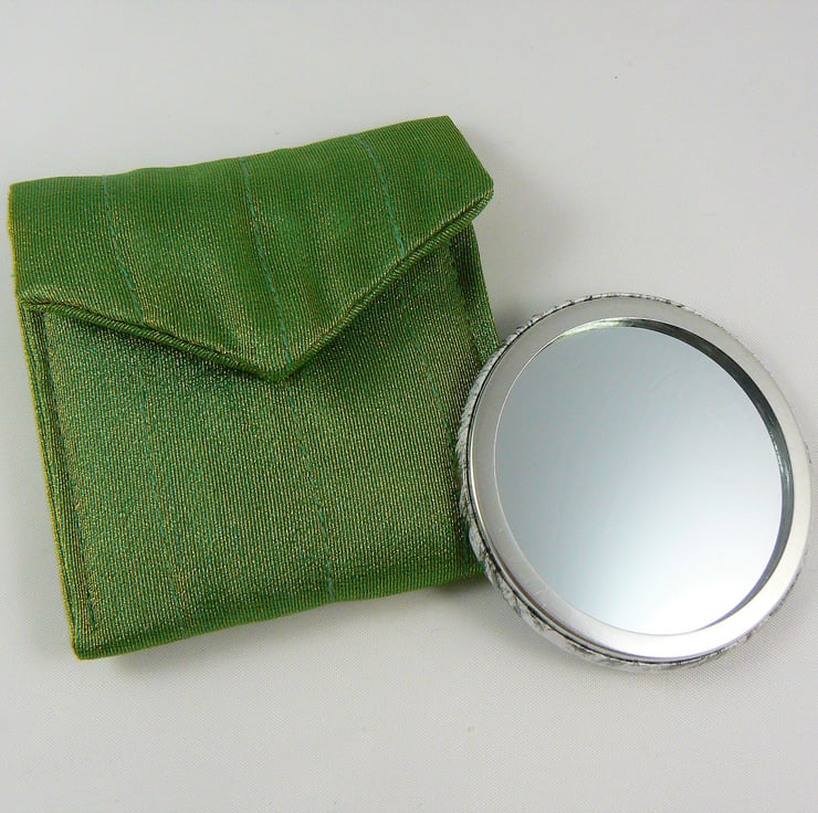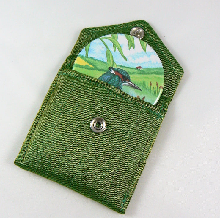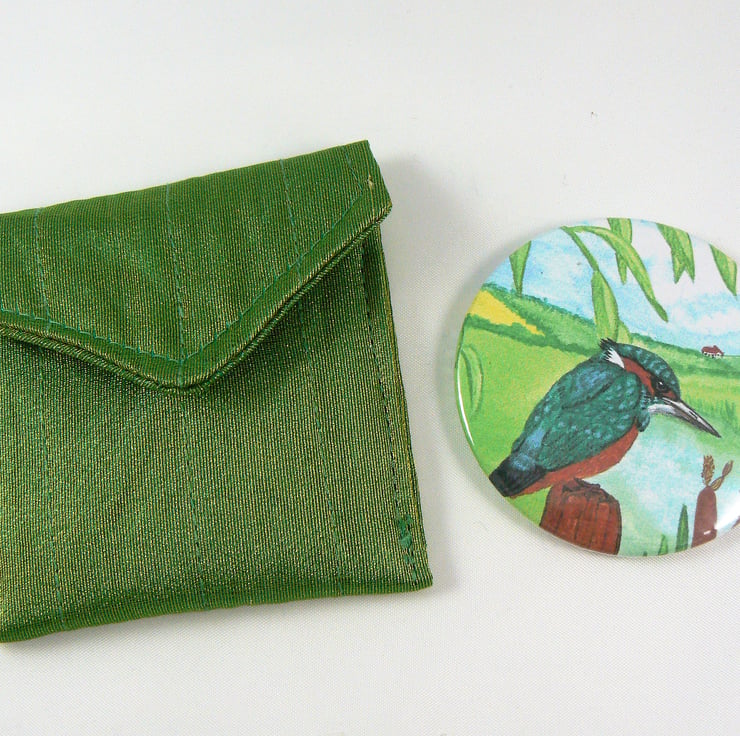 This kingfisher is a print of one of my original paintings and is protected with a strong plastic film over the top on this mirror. I have made a slightly padded pouch for the mirror of emerald green satin overlaid with green iridescent organza material which complements the kingfisher perfectly.
