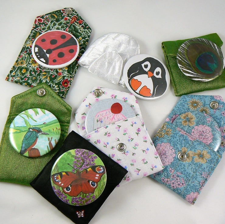 The mirror measures 58 cm ( 2 1/4") and the pouch measures 7.5 cm x 7.5 cm ( 3" x 3" ) and is fastened with a popper.