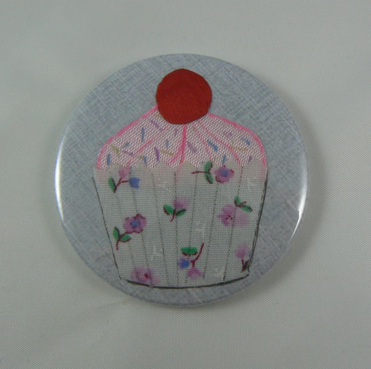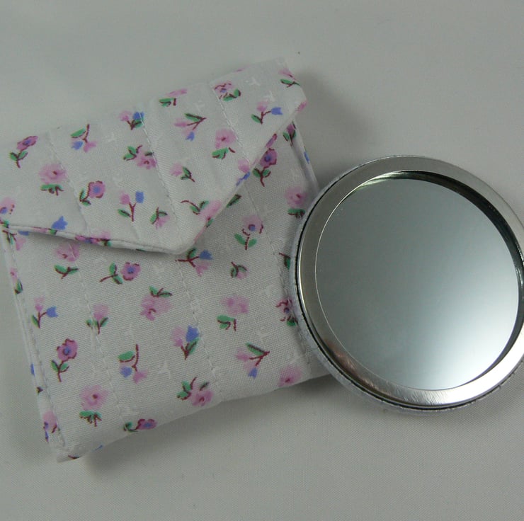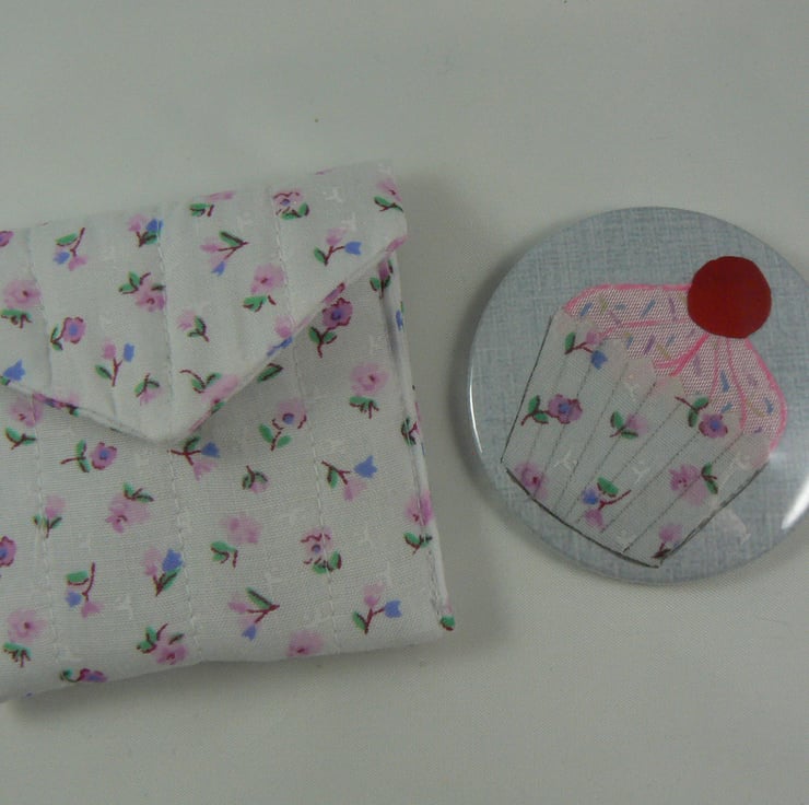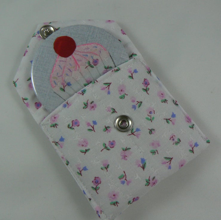 I have made this handbag mirror using satin and cotton fabric for the yummy cupcake and gel pens for the hundreds and thousands, this is covered with a strong plastic film to protect the image. The pouch I have slightly padded and made in the same cotton fabric as the cupcake case (this fabric so reminds me of cake cases!) and I have added a popper to close.