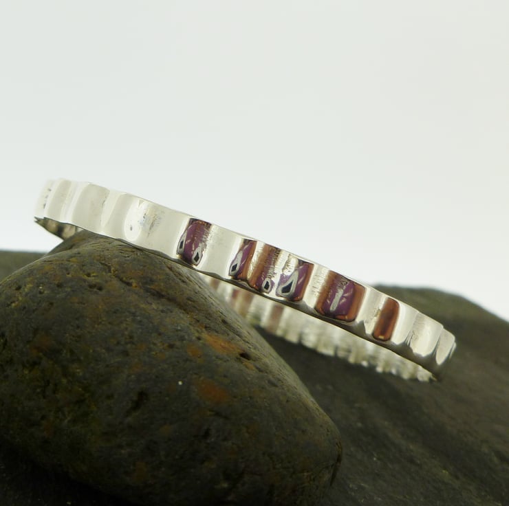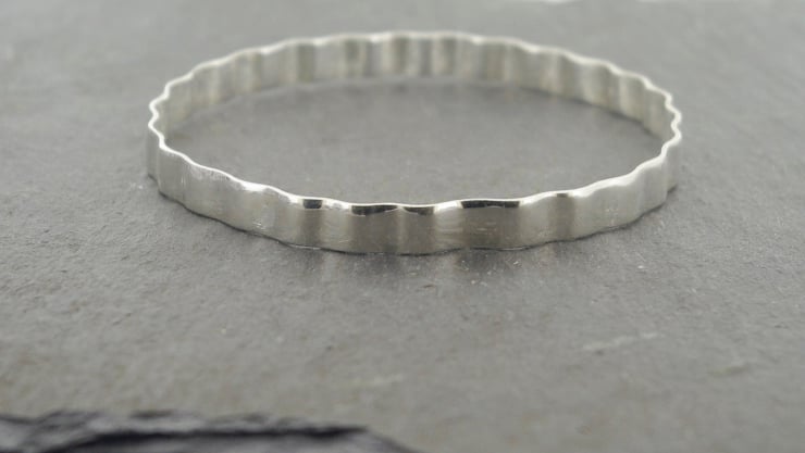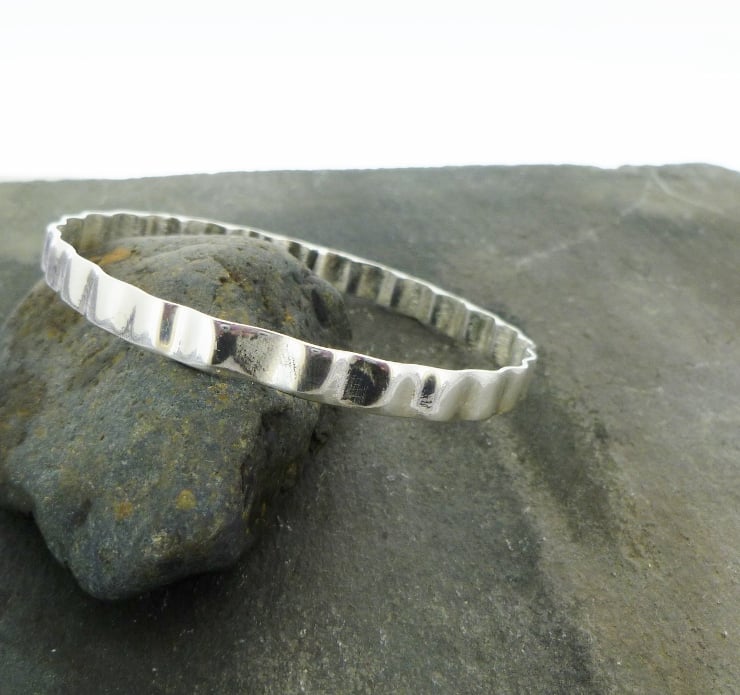 Made from 6mm wide 1.2mm thick sterling silver rectangular wire, the wire is shaped and then soldered to form this bangle.