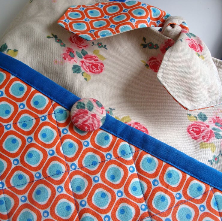 Made in two lovely cotton fabrics . Front pocket has been quilted and embellished with a covered button .