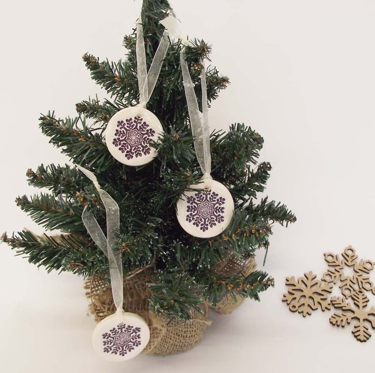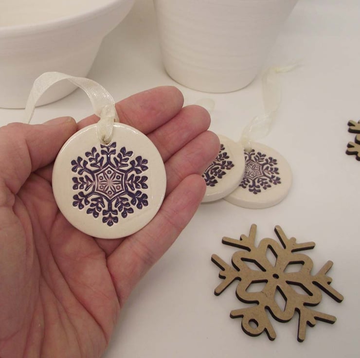 These bright, bold snowflakes are made from white eartheware clay and finished in a lovely glossy glaze.
