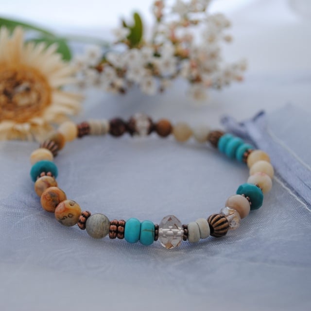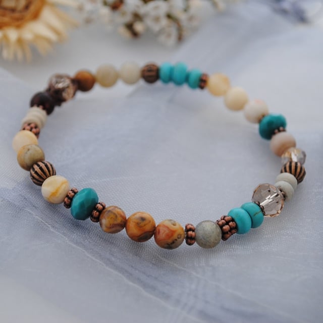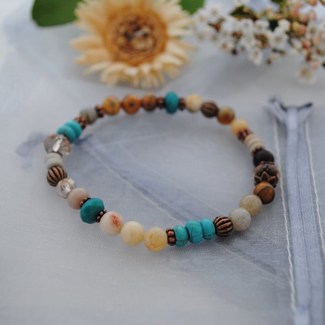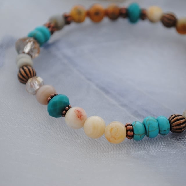 Eclectic quality semi-precious stone bracelet in turquoise, cream, copper and sand tones.