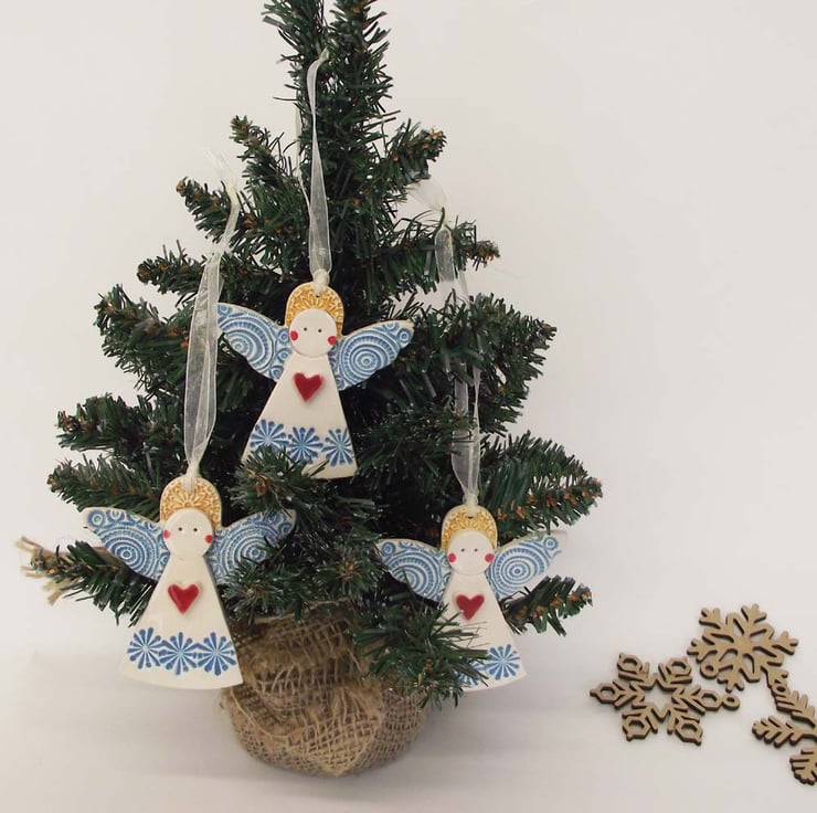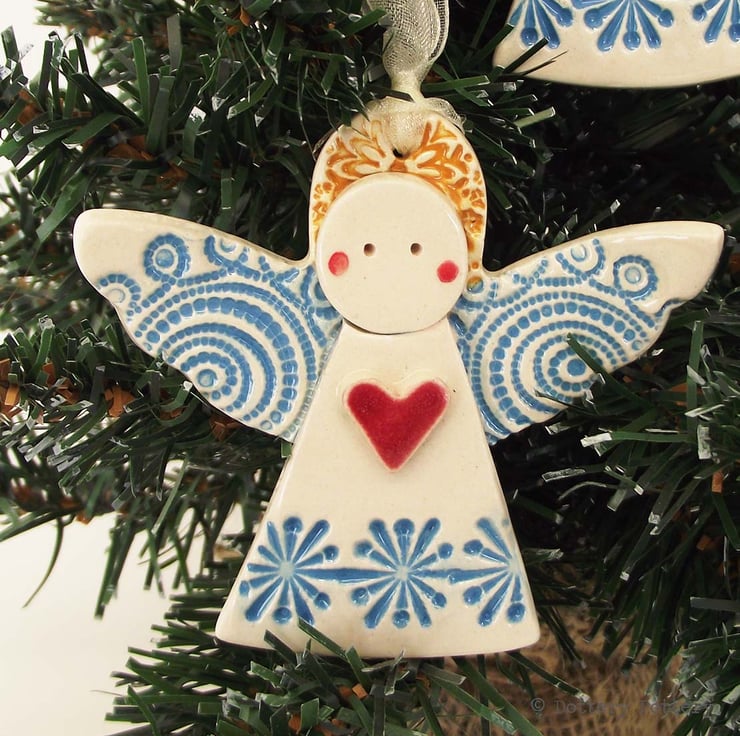 These cute little angels are made from white earthenware clay and decorated with coloured slips and glazes. They are fired twice.