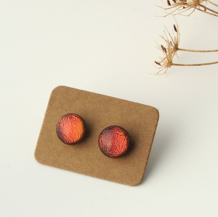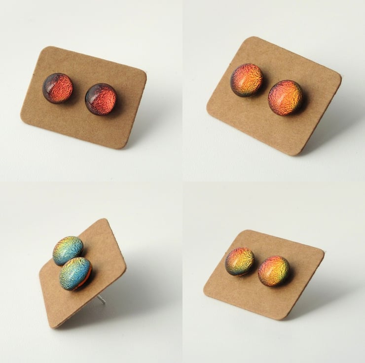 These stunning earrings are created from dichroic glass. Look straight at them and they appear to be a rich sparkling red colour, but move around and everything changes, you will see a variety of autumn shades. All the images in the second picture are this same pair of earrings (honest!) taken from different angles.