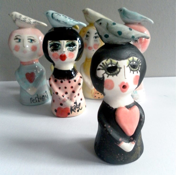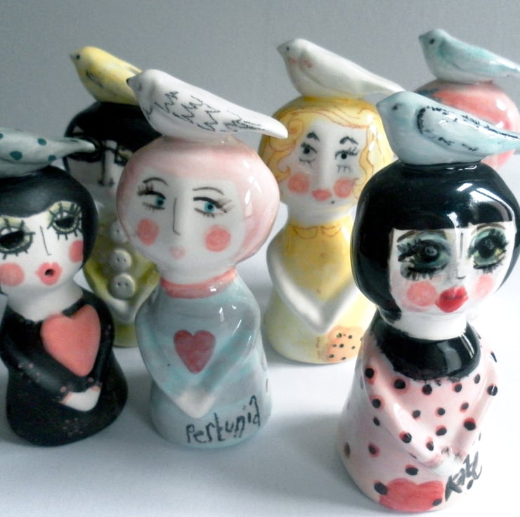 A cute little ceramic lady with her pet birdie on her head. Hand decorated & glazed. little holes on the bottom for a tag and ribbon for gifting