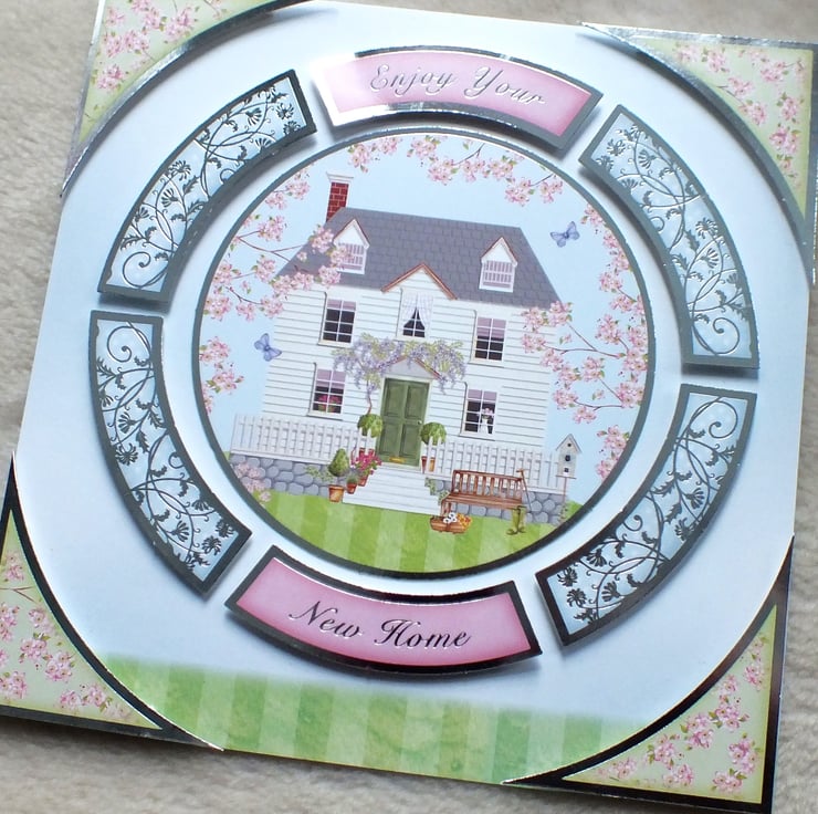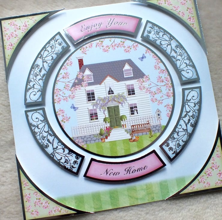 This is a large, handmade new home card at 8"x8" square. Picturing a dream home, this design is matted and layered with foil embossed card stock. Includes 'Congratulations on your New Home' sentiment, inside.