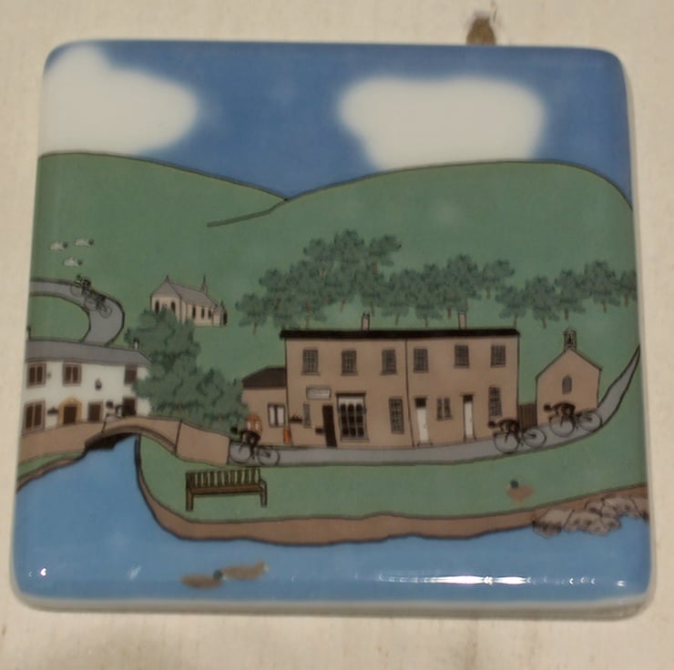 A souvenir of Dunsop Bridge,and of the Tour of Britain's Lancashire route. This handmade glass coaster depicts cyclists cycling through Dunsop Bridge the centre of the UK and past the Puddleducks post office and café. A delightful cycling area.