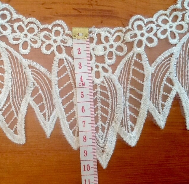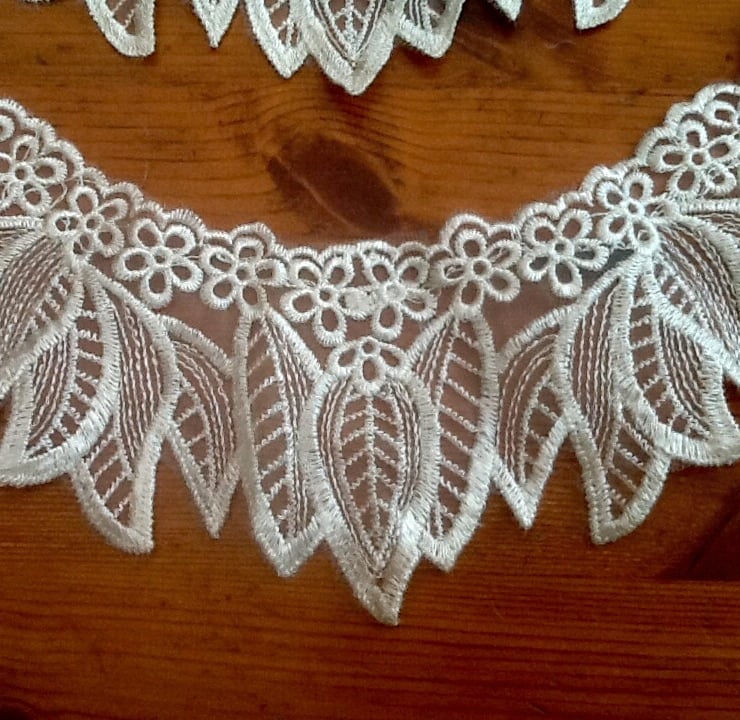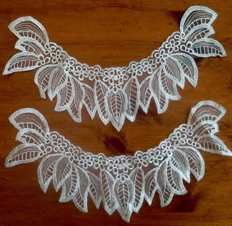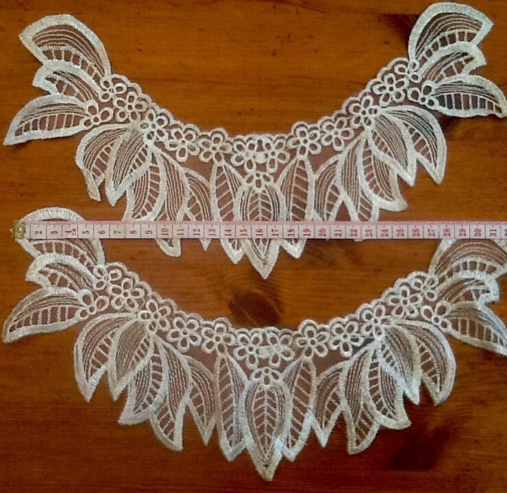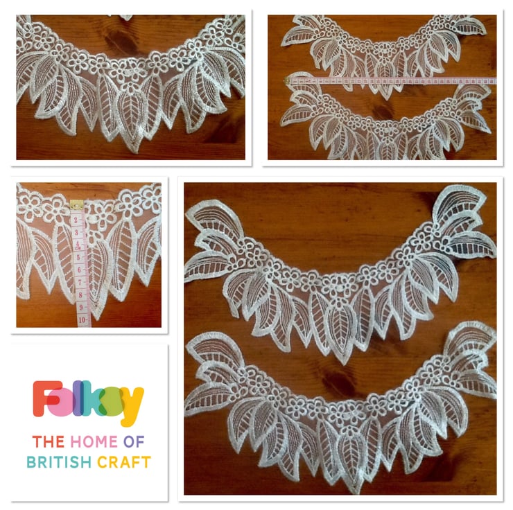 Pair of Curved Lace trims with a leaf design, perfect for a crafting project or to use in clothing design. This pair of cream coloured lace trims are approx 33cms by 10cms, as can be seen in the attached photographs!