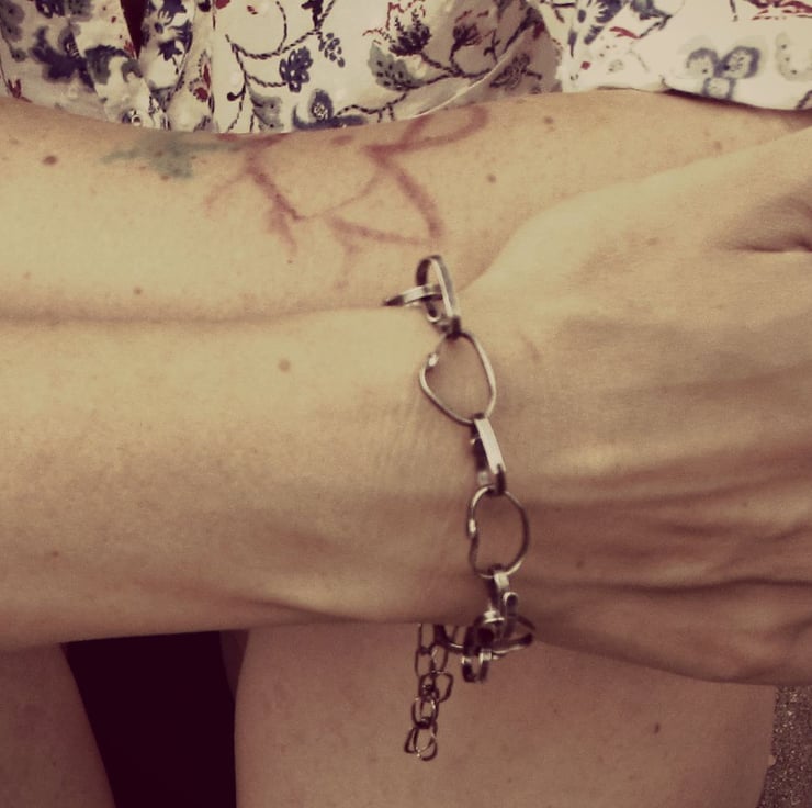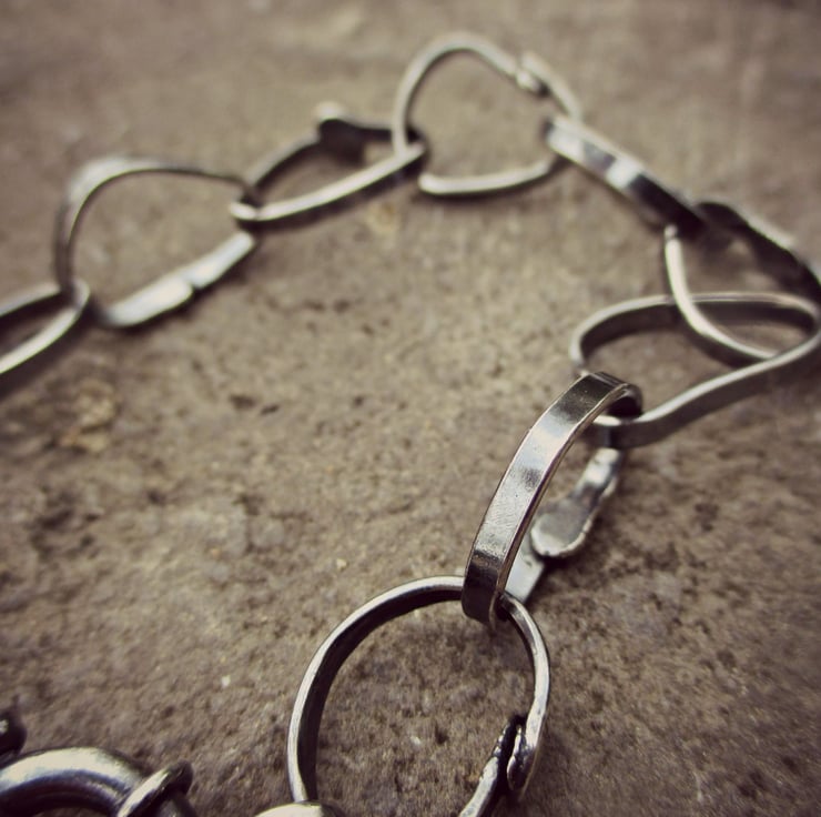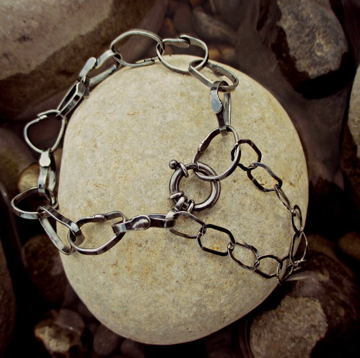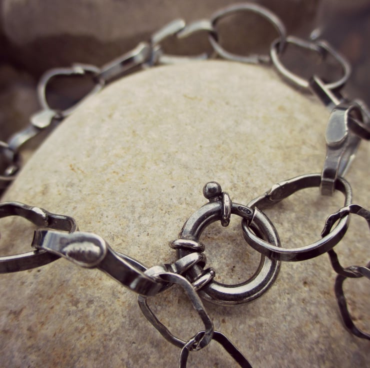 There is a sweet extender chain, a chunky bolt catch, and the whole bracelet is oxidised to give it a rich dark patina. Over time this will be smoothed back and the Silver will show through adding more character to the piece over the years.