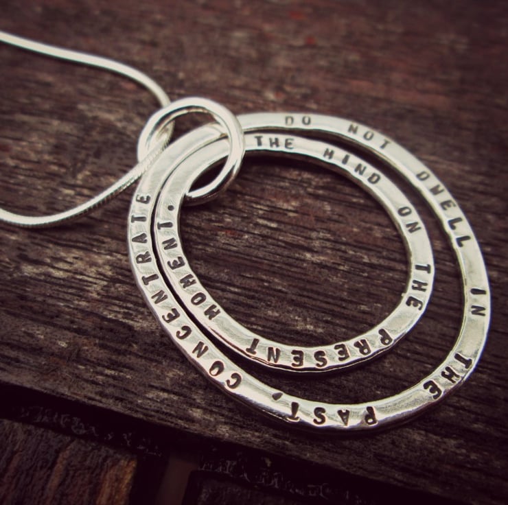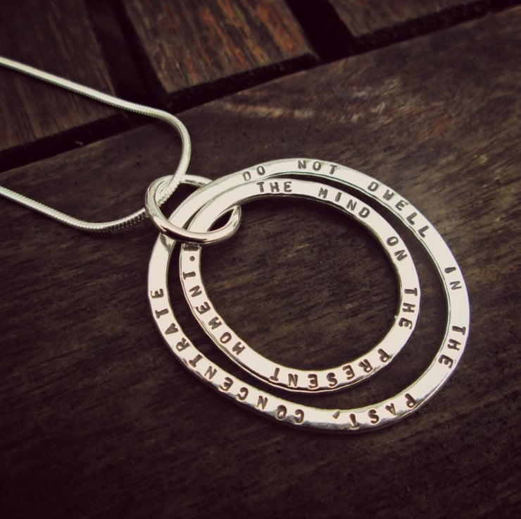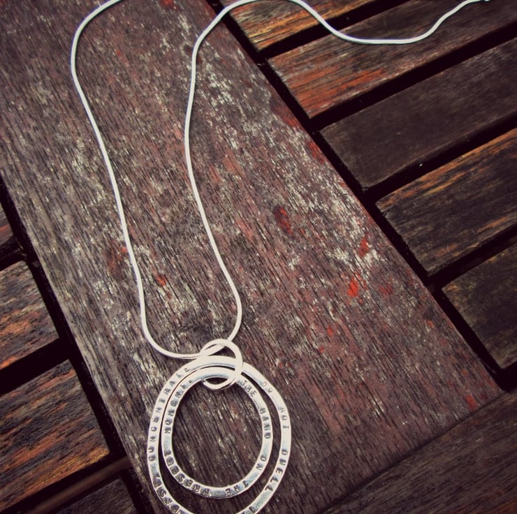Two hand forged Sterling Silver hoops hang around together and carry the words that matter the most to you.