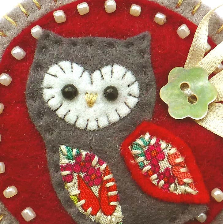 This is a gorgeous handmade, hand stitched owl brooch.